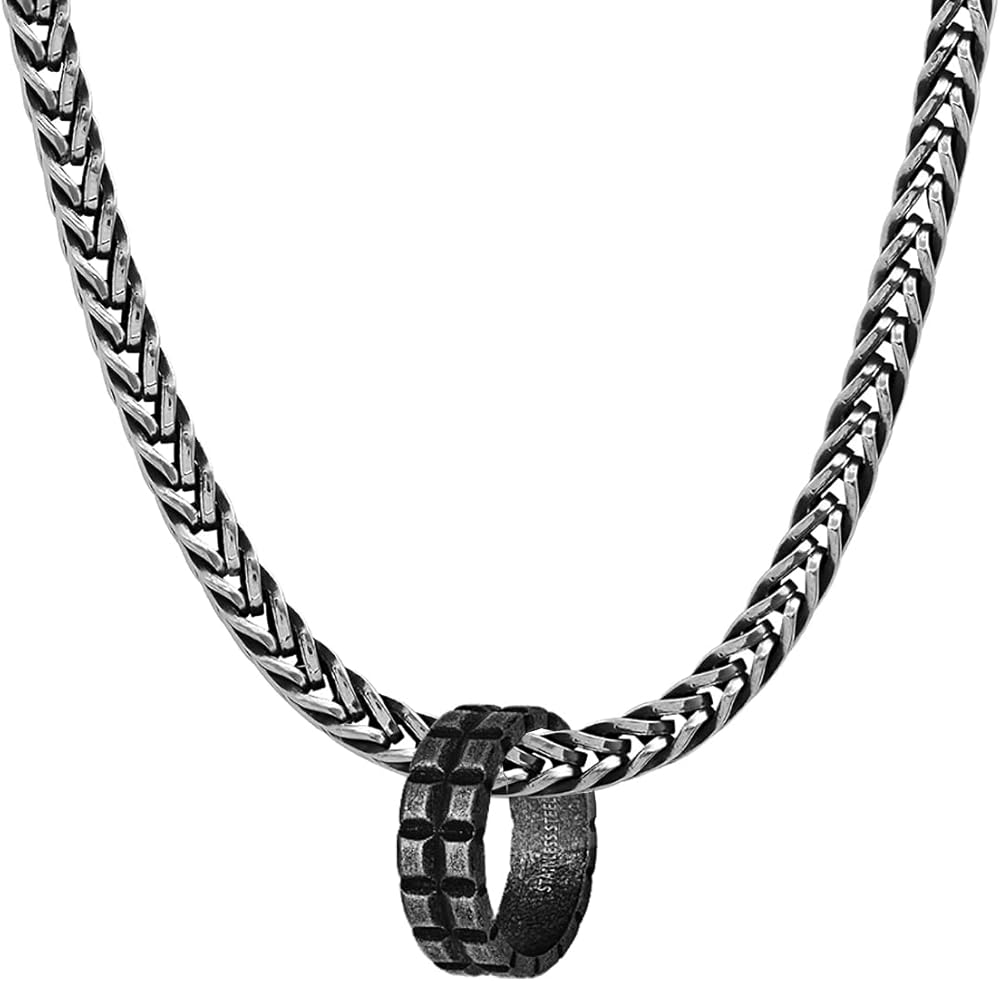 This ring pendant necklace set features a detailed oxidized textured ring pendant pairing beautifully with an oxidized wheat chain necklace. This unique necklace set gives you the option to wear the ring and chain on its own or as a beautiful pendant necklace. Made of premium stainless steel featuring a 24" chain. This genuine stainless-steel necklace brings the modern style you need to wear anywhere. It's tough and eye catching without distracting from your everyday look. All our jewelry is made of high-quality materials, using advanced coating technology to ensure that it won't tarnish after a long-term use. This necklace includes a protective velvet pouch protecting your jewelry from any damage. Stainless Steel jewelry does not tarnish or oxidize, which can last longer than other jewelries. Its durability is unmatched and is amazingly hypoallergenic. Such advantages make it a more popular accessory.