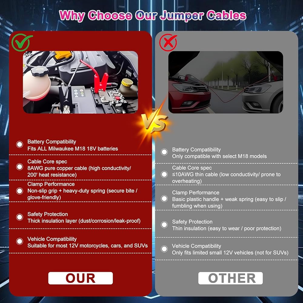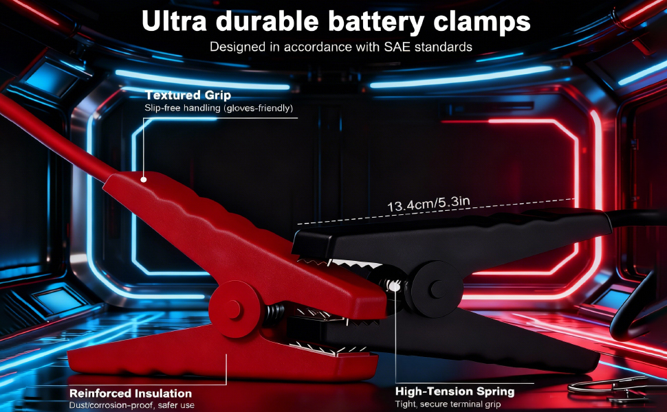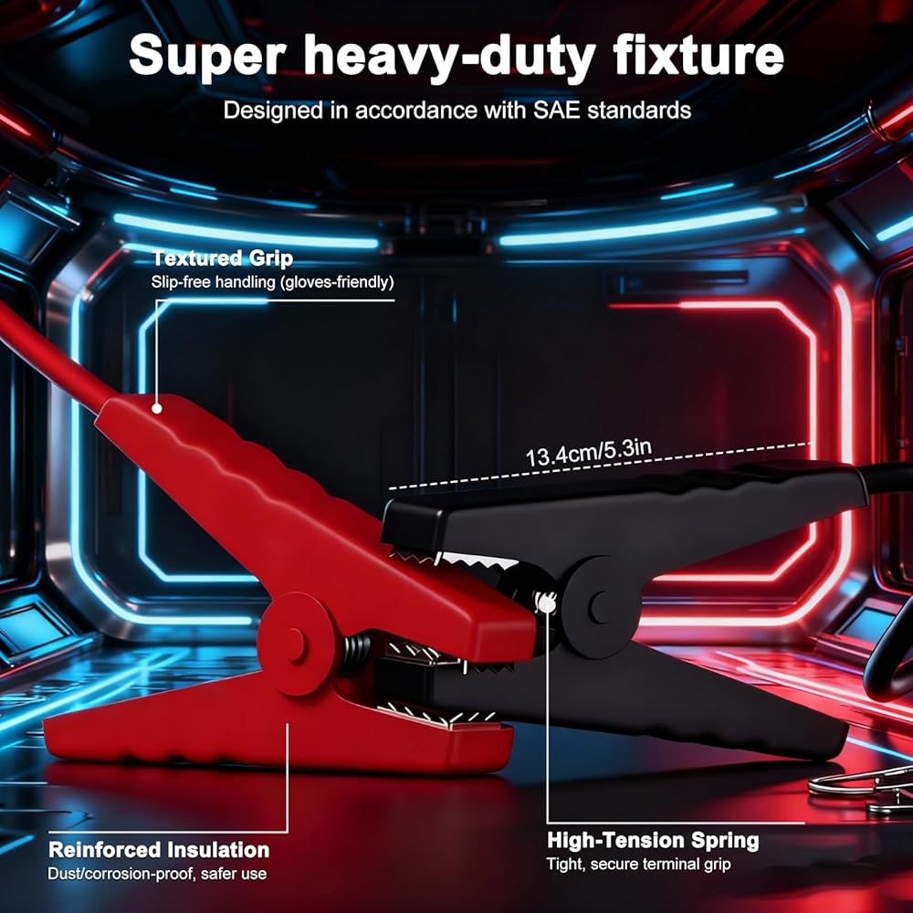 مشابك التمساح: تتميز بمشابك تمساح معزولة بشكل كبير من أجل قبضة قوية ومستقرة على أطراف البطارية، وتضمن هذه المشابك بدء تشغيل آمن وفعال في كل مرة.