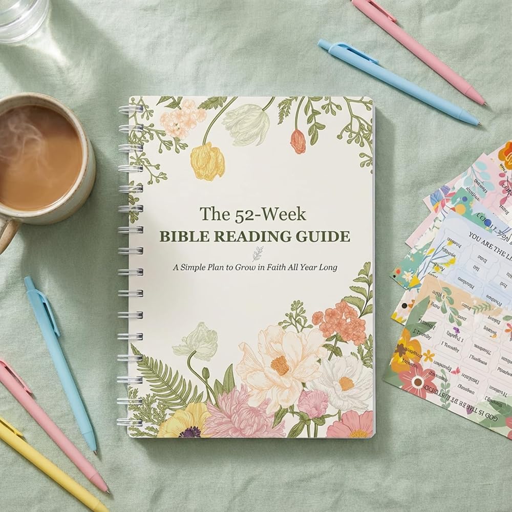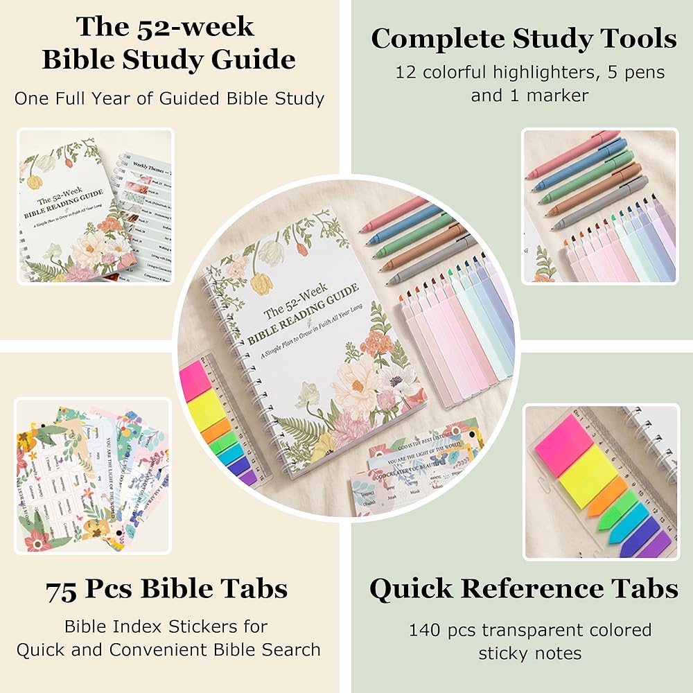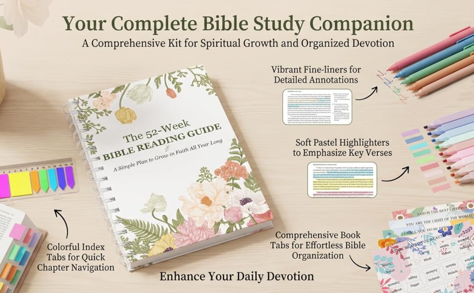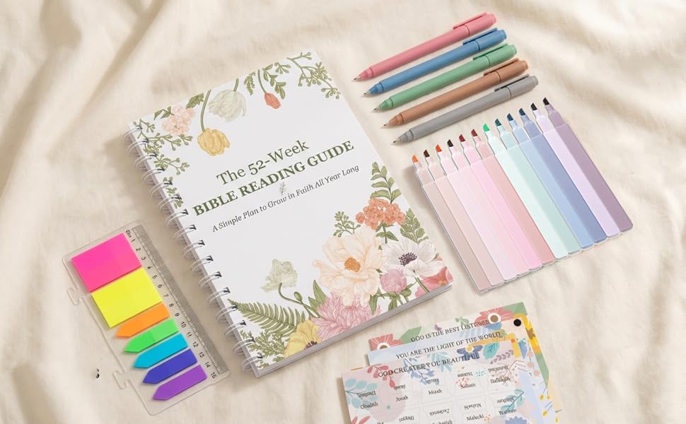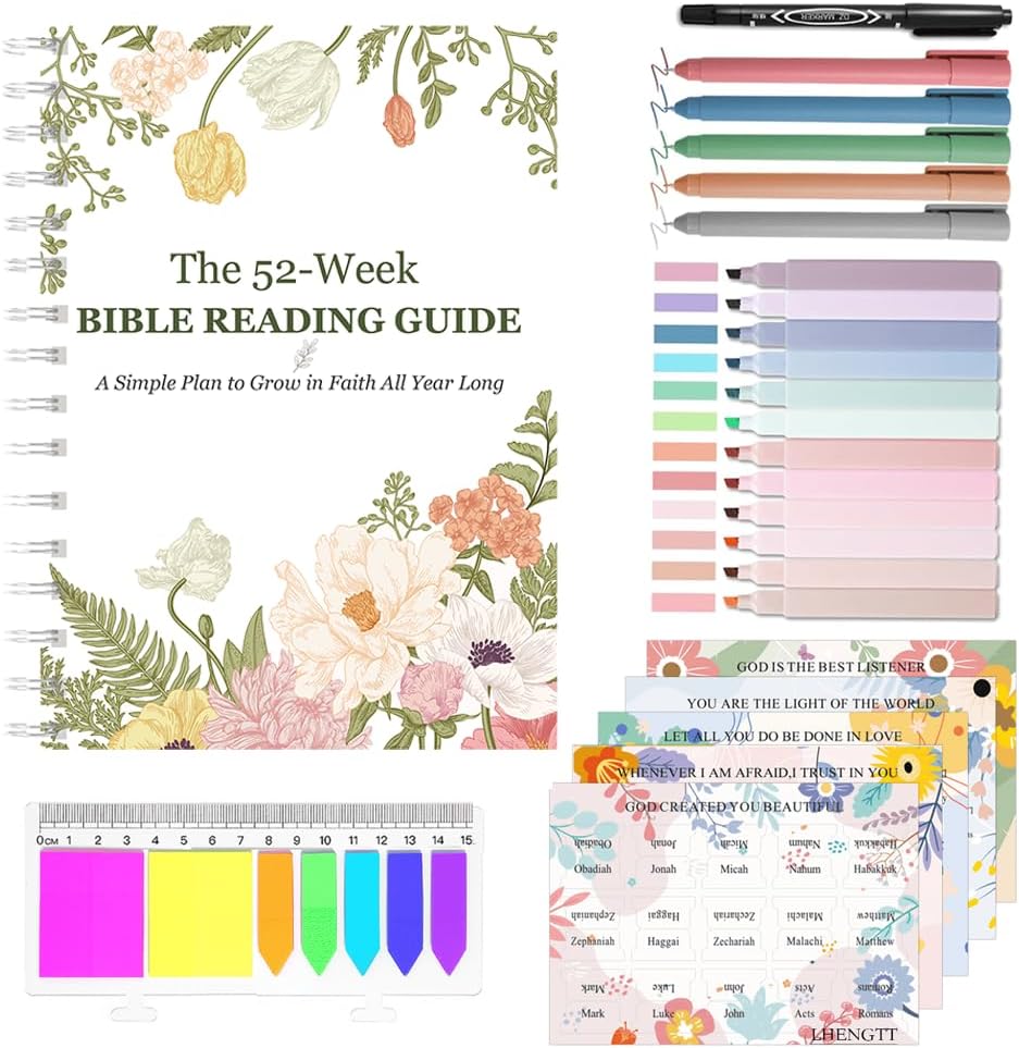 مجموعة مجلة دراسة الكتاب المقدس لمدة 52 أسبوعًا للنساء، مخطط قراءة الكتاب المقدس والتأمل لمدة عام، دفتر ملاحظات تعبدي مسيحي مع أقلام تمييز وأقلام وعلامات تبويب الفهرسة، مجموعة مذكرات دينية مقاس A5