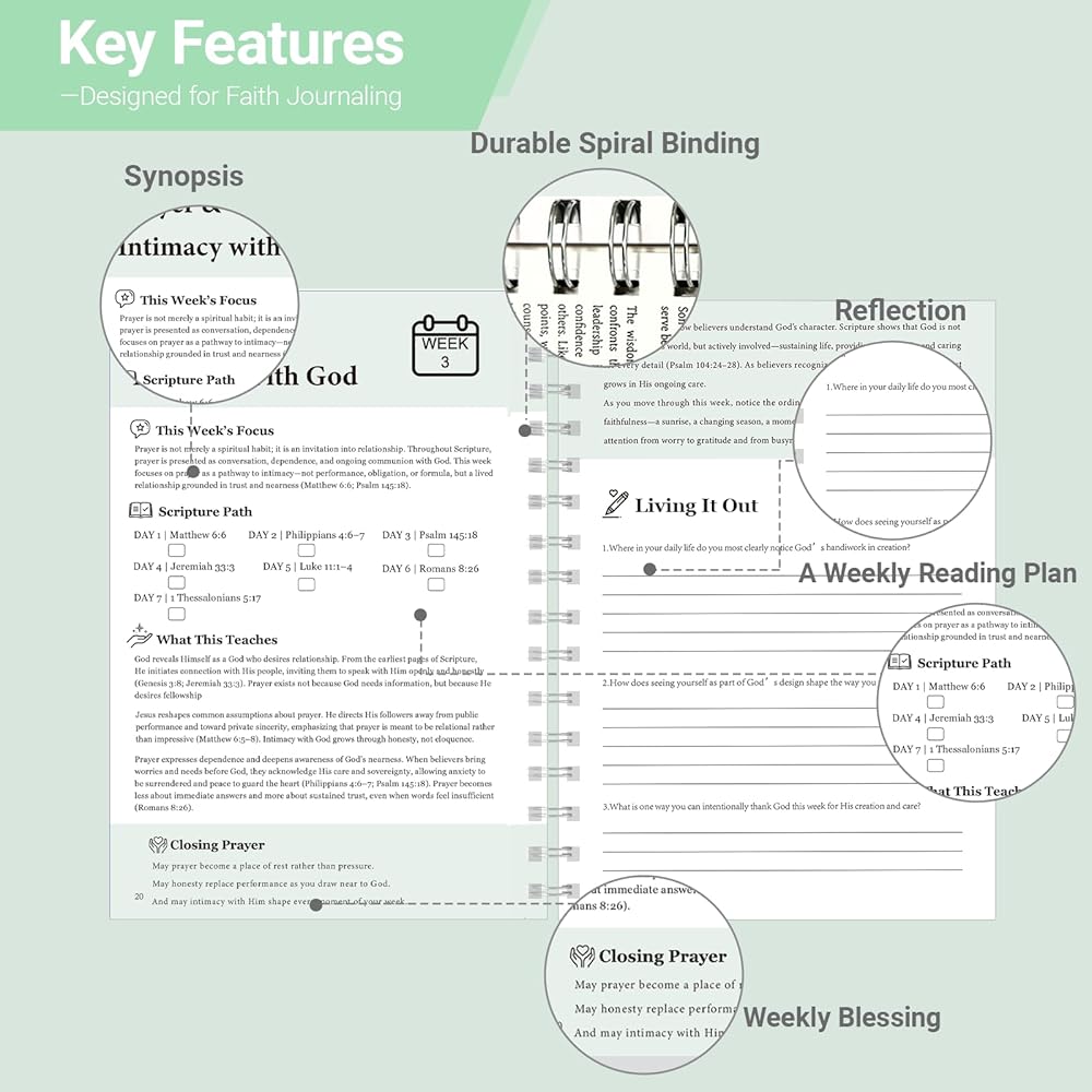 【تخطيط مدروس لسهولة الاستخدام】تم تصميم خطط القراءة الأسبوعية ومطالبات التأمل وصفحات الملاحظات بشكل واضح لدعم القراء المبتدئين وذوي الخبرة على حد سواء، مما يجعل دراسة الكتاب المقدس بسيطة ومشجعة كل يوم.