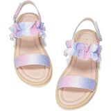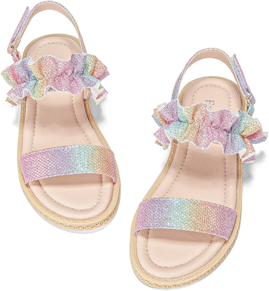 • GLITTER PRINCESS SANDALS: Girls sandals featuring adorable decorative elements accents in beautiful pastel rainbow colors. Eye-catching straps with shimmering glitter finish in gradient pastel shades of pink, purple, and blue for a magical look