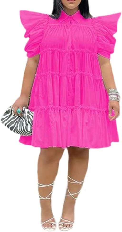 CCIGO Womens Half Sleeve Lapel Collar Solid Color Button Down Shirt Dress