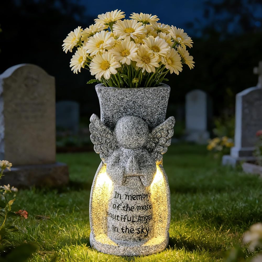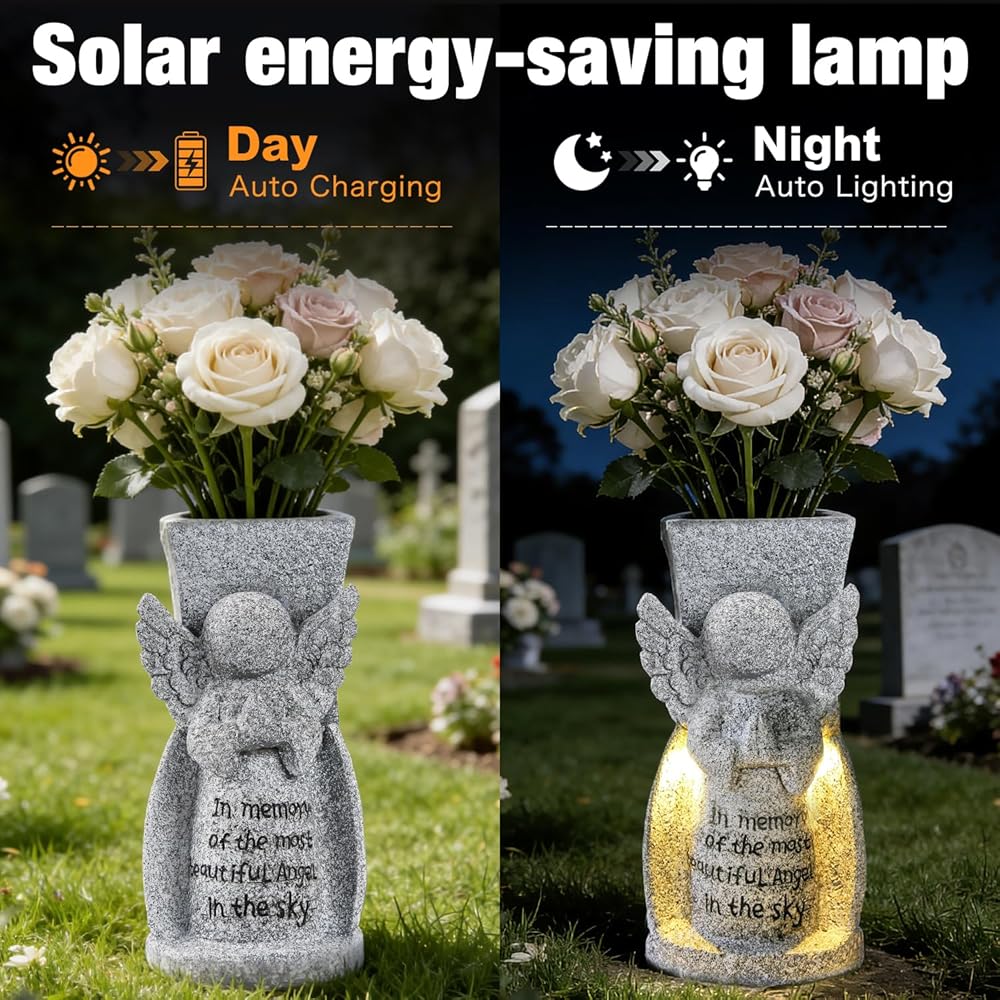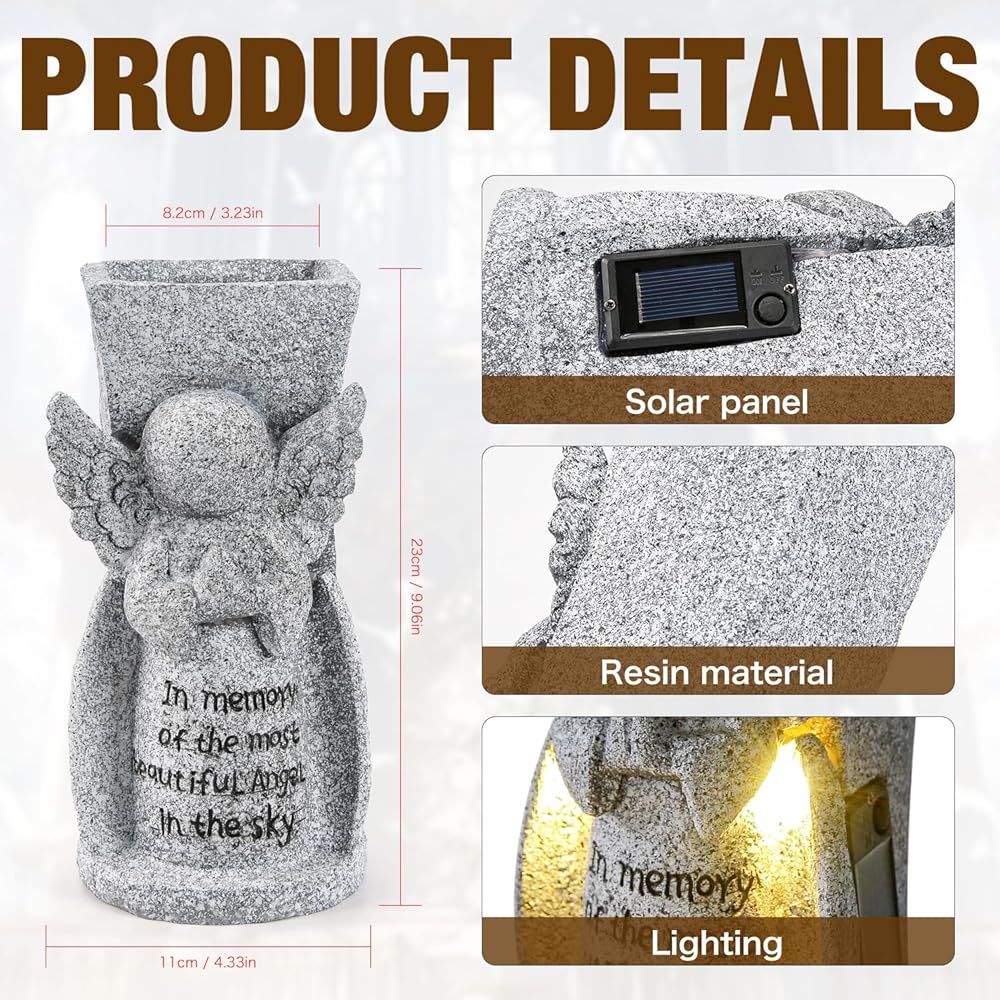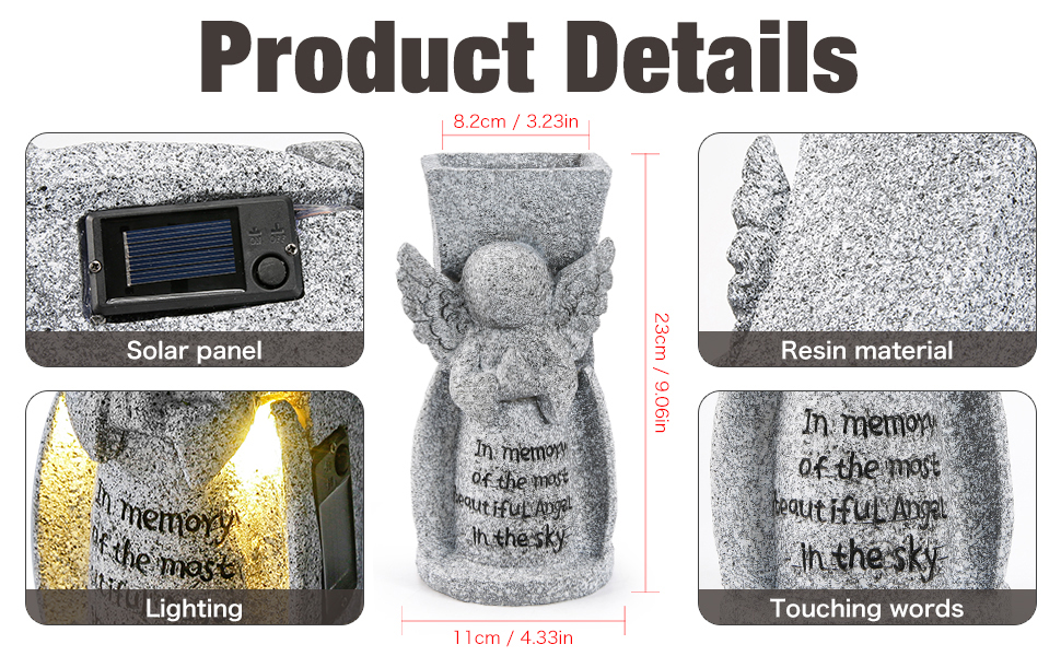 إضاءة LED بالطاقة الشمسية التلقائية: يتميز هذا الملاك بلوحة شمسية مدمجة عالية الكفاءة، مما يضمن تشغيلًا خاليًا من المتاعب تمامًا. يضيء تلقائيًا عند الغسق، ويطلق توهجًا دافئًا ومريحًا يضيء الرسالة المحفورة القلبية: "في ذكرى أجمل ملاك في السماء". يوفر وجودًا هادئًا ومتوهجًا ليلة بعد ليلة دون الحاجة إلى بطاريات أو أسلاك.