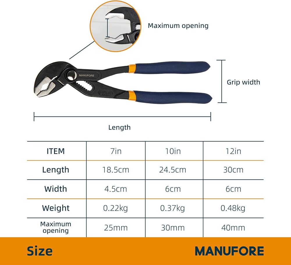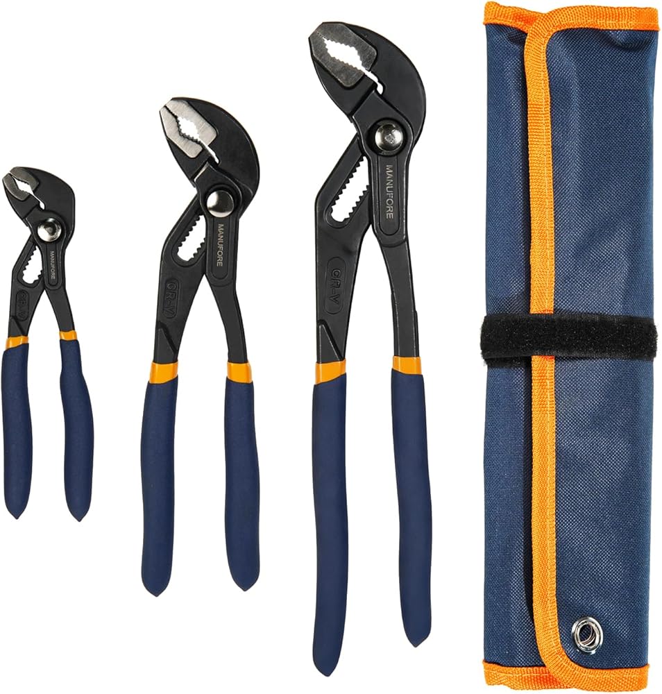 • 3-Piece Adjustable Groove Joint Pliers Set: Includes 7", 10", and 12" water pump pliers for gripping, holding, and twisting pipes, nuts, and bolts in plumbing, automotive, and household repair projects