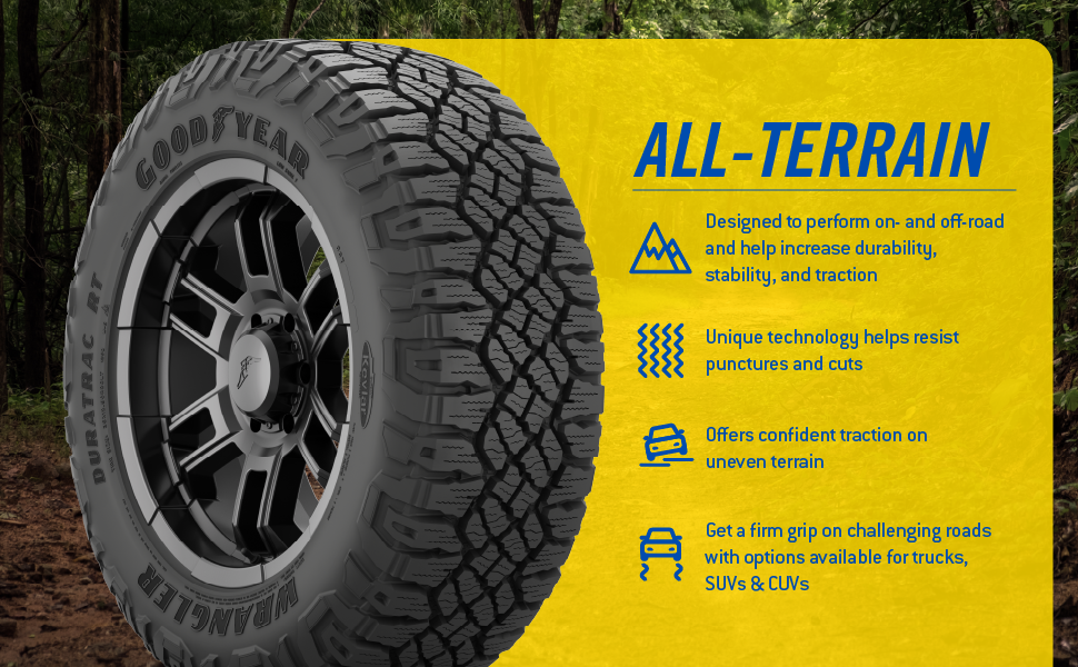 BIG-TIME GRIP: These Goodyear tires are designed with large tread blocks to help keep the tire moving through difficult mud, sand and rocky terrains