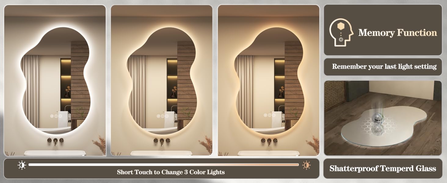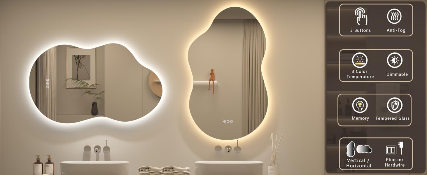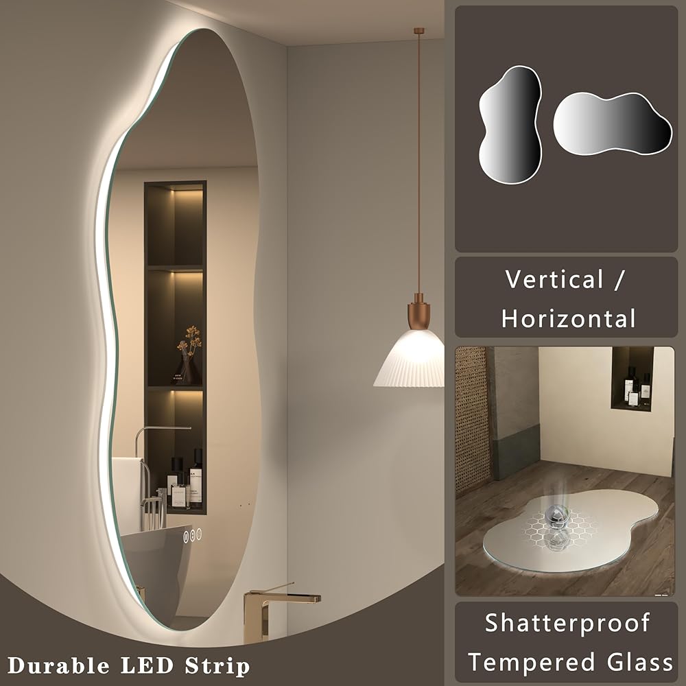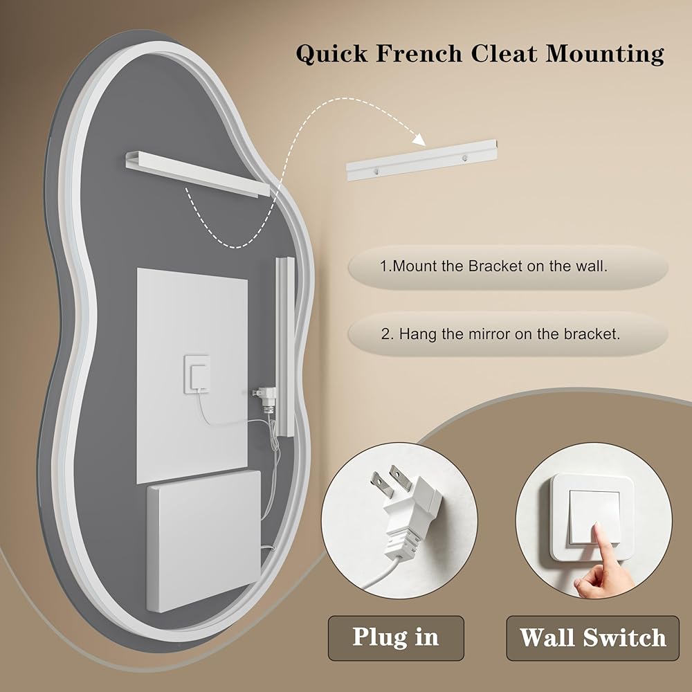 تركيب مرن وسهل: ثبت المربط الفرنسي على الحائط وقم بتعليق مرآة LED غير المنتظمة أفقيًا أو رأسيًا لتناسب تصميم حمامك وشكله الشخصي تمامًا.