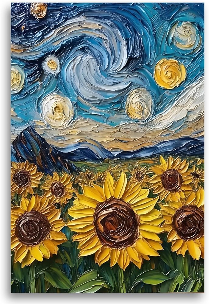 • 【رمز فريد من نوعه】: يشكل دفء وحيوية عباد الشمس وعمق وغموض السماء المرصعة بالنجوم تباينًا فريدًا، يرمز إلى الأمل في العالم المجهول. بالإضافة إلى ذلك، تنقل كل ضربة جو الفنان من تقديس الطبيعة والكون.