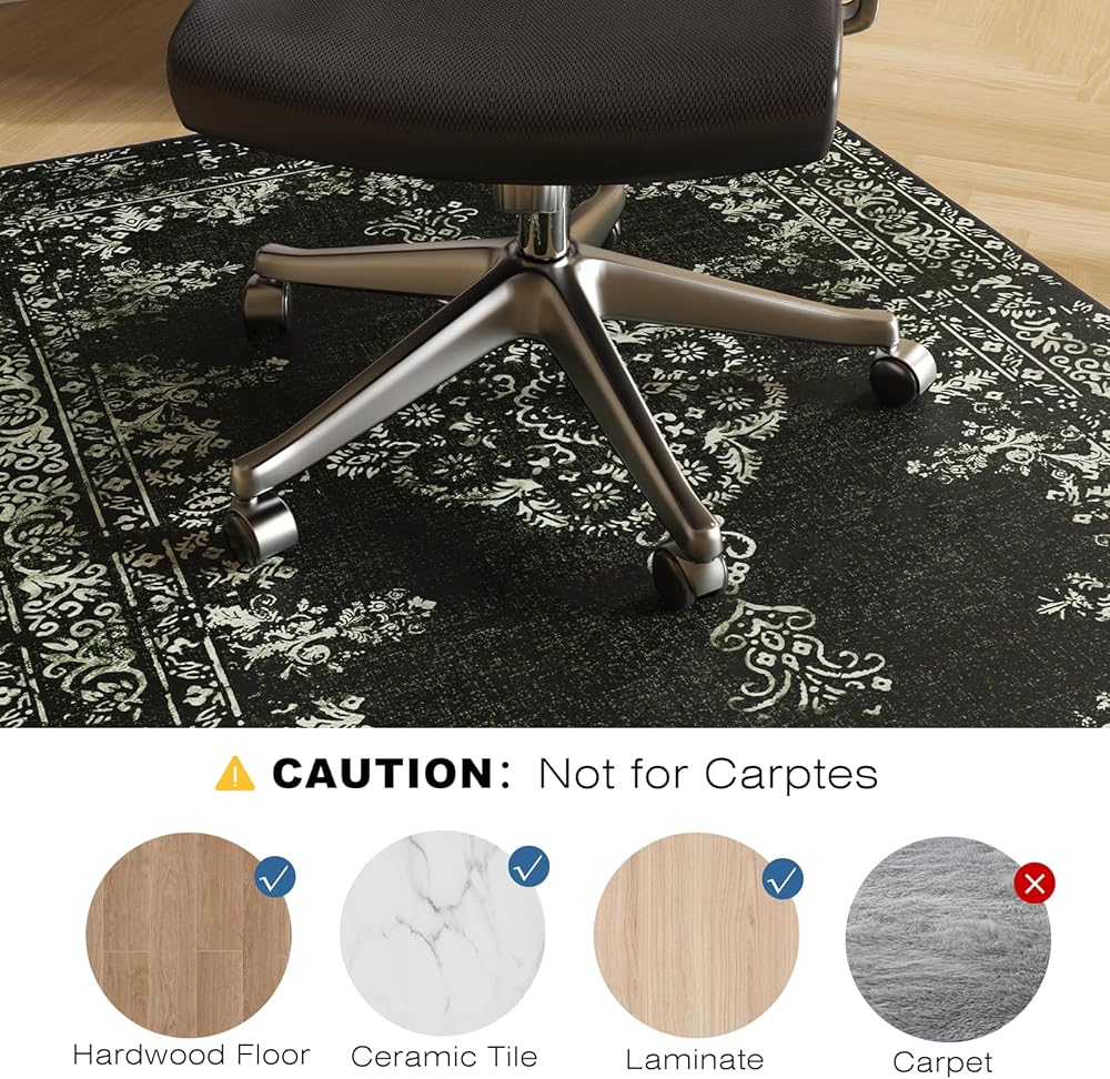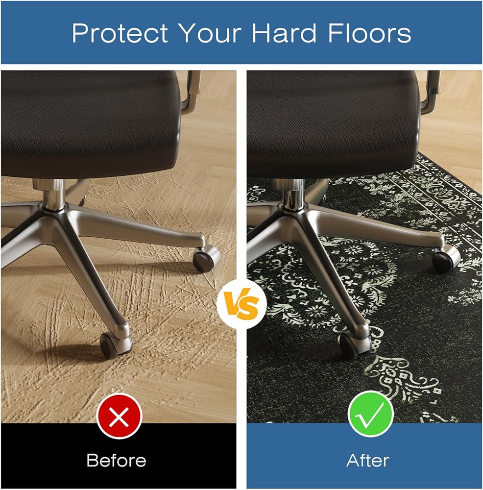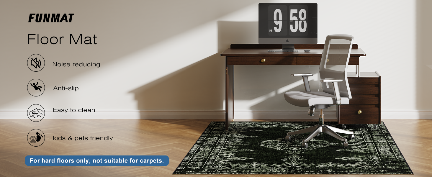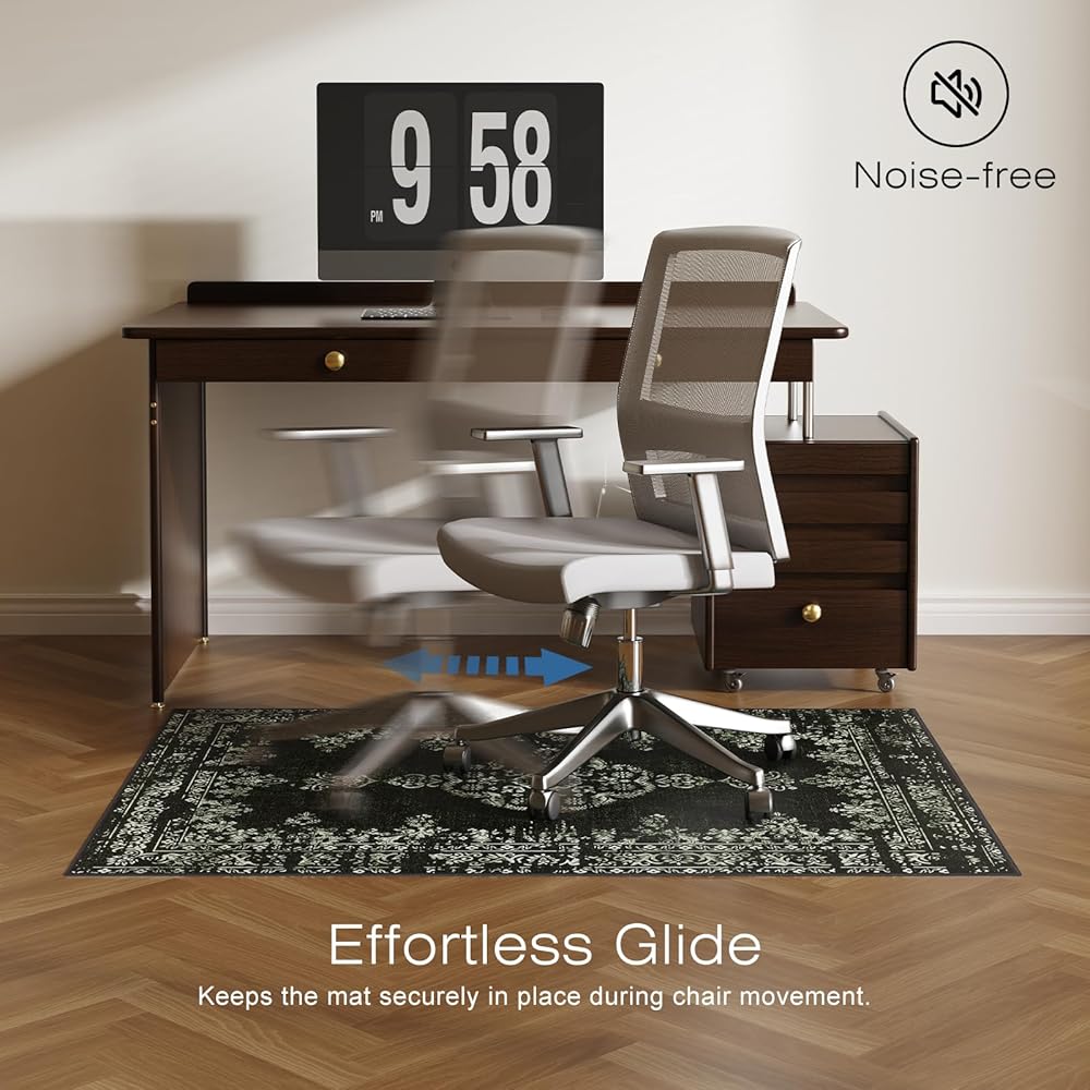 مقاومة للانزلاق وتقليل الضوضاء: تتميز سجادة كرسي المكتب FUNMAT بظهر متين مضاد للانزلاق لتحقيق الثبات وتقليل الضوضاء الناتجة عن حركة الكرسي، مما يضمن مساحة عمل هادئة ومريحة. إنه يحمي أرضياتك بينما يسمح بحركة الكرسي بسلاسة. ملحوظة: للأرضيات الصلبة فقط.