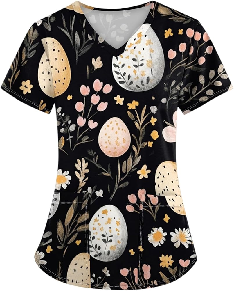 • Women'S Easter Tops Petite Scrubs For Women Short Sleeve V Neck Egg Top Scrub Uniforms Black Nursing Uniform Tops With Pockets X-Large 98