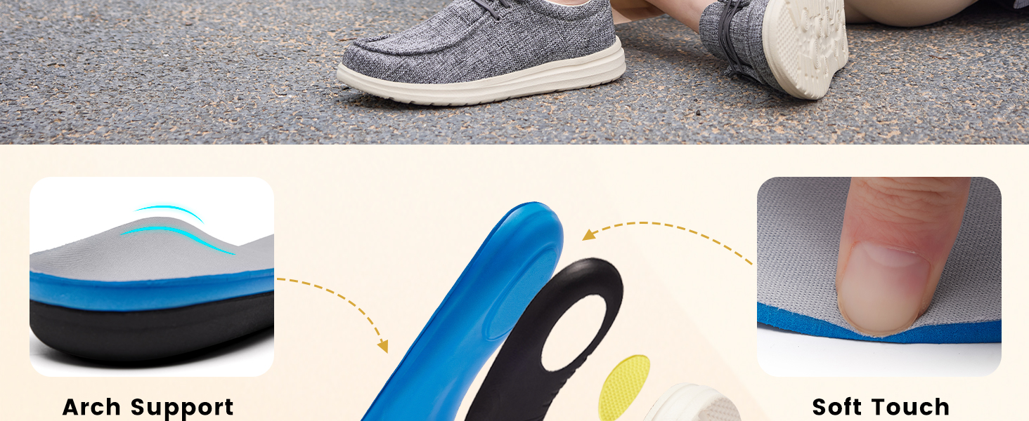 دعم القوس: نعال داخلية لتقويم العظام قابلة للإزالة، مصممة خصيصًا للأفراد الذين يعانون من أقدام مسطحة وآلام في القدم، توفر دعمًا قويًا إضافيًا لقوس القدم بالإضافة إلى تقنية الحماية من الصدمات لتخفيف إجهاد القدم والساق وتقليل آلام أسفل الظهر وتوزيع الوزن وتقليل تأثير كل خطوة.