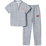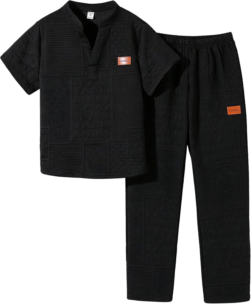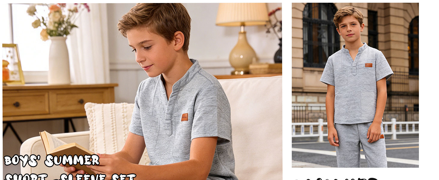 ياقة أنيقة: يتميز الجزء العلوي قصير الأكمام بياقة ماندرين عصرية مع تفاصيل نصف فتحة، مما يضيف طرازًا مصقولاً. نسيج مبطن ورقعة شعار جلدية صغيرة تخلق مظهرًا عصريًا ومميزًا يحبه الأولاد