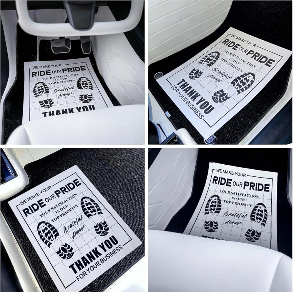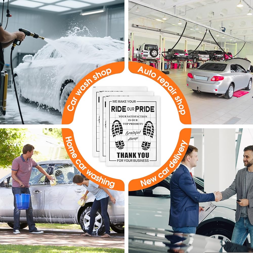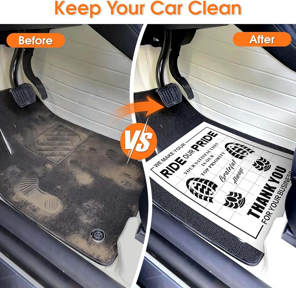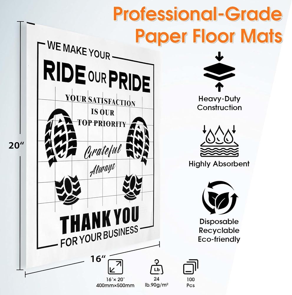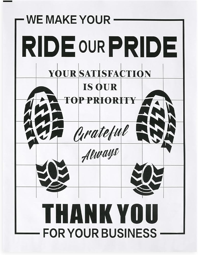Clean footprint graphics and thoughtful service messaging leave customers with a positive final impression. The universal 16 x 20 inch size fits most cars, SUVs, and trucks. The 100-pack bulk quantity delivers long-lasting value for daily operations.