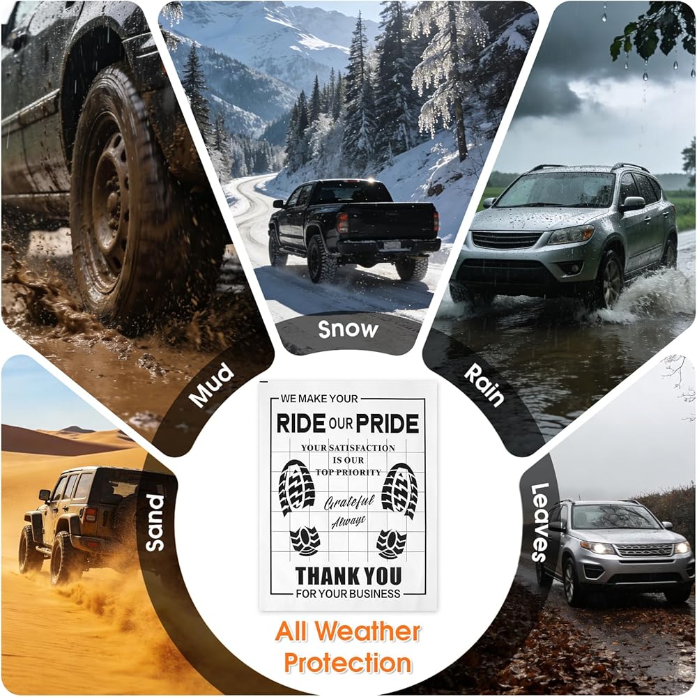 • Thank You Design That Elevates Customer Experience - Printed with clean footprint graphics and thoughtful service messages such as “We Make Your Ride Our Pride”, these mats protect interiors while reinforcing professionalism and leaving customers with a positive final impression.