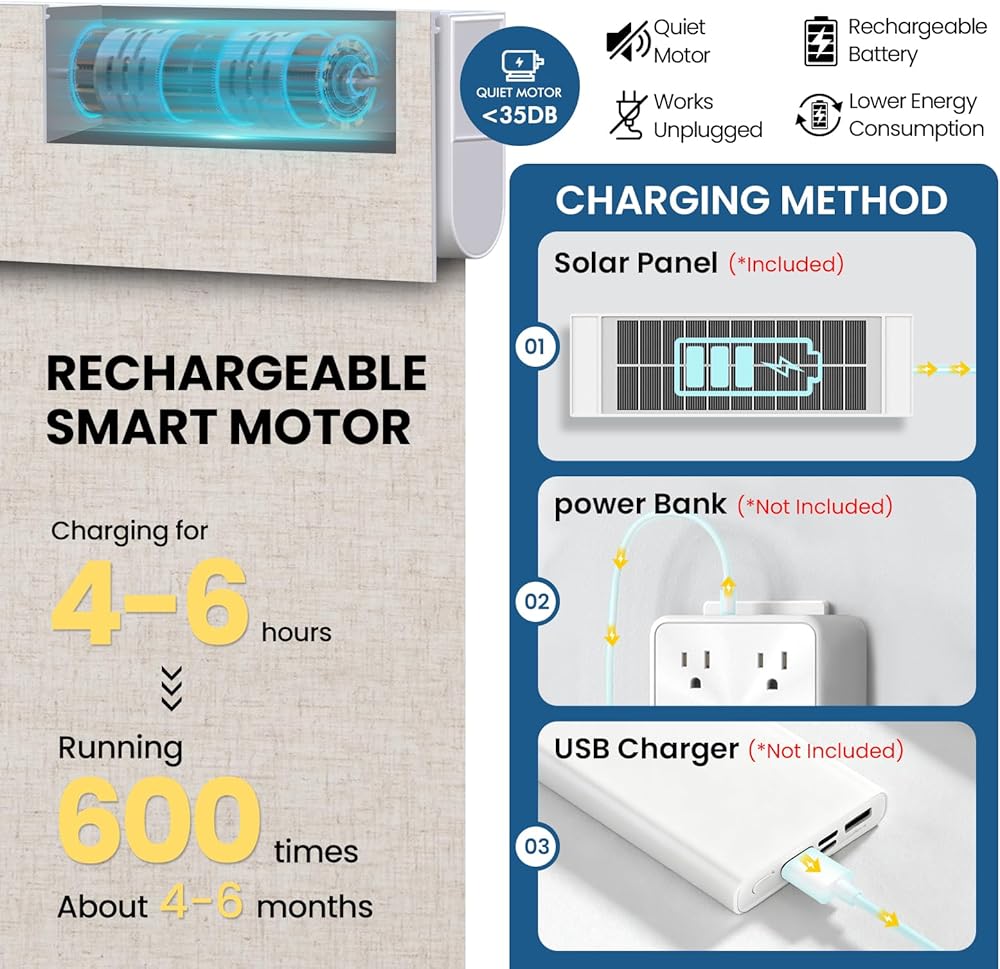 لوحة شمسية وصديقة للبيئة: تأتي كل ستارة كهربائية مزودة بلوحة شمسية مخصصة تحافظ على تشغيل ظلالك بشكل مستمر. لا مزيد من سلالم التسلق لاستبدال البطاريات، مما يضمن السلامة والراحة مع تقليل النفايات.