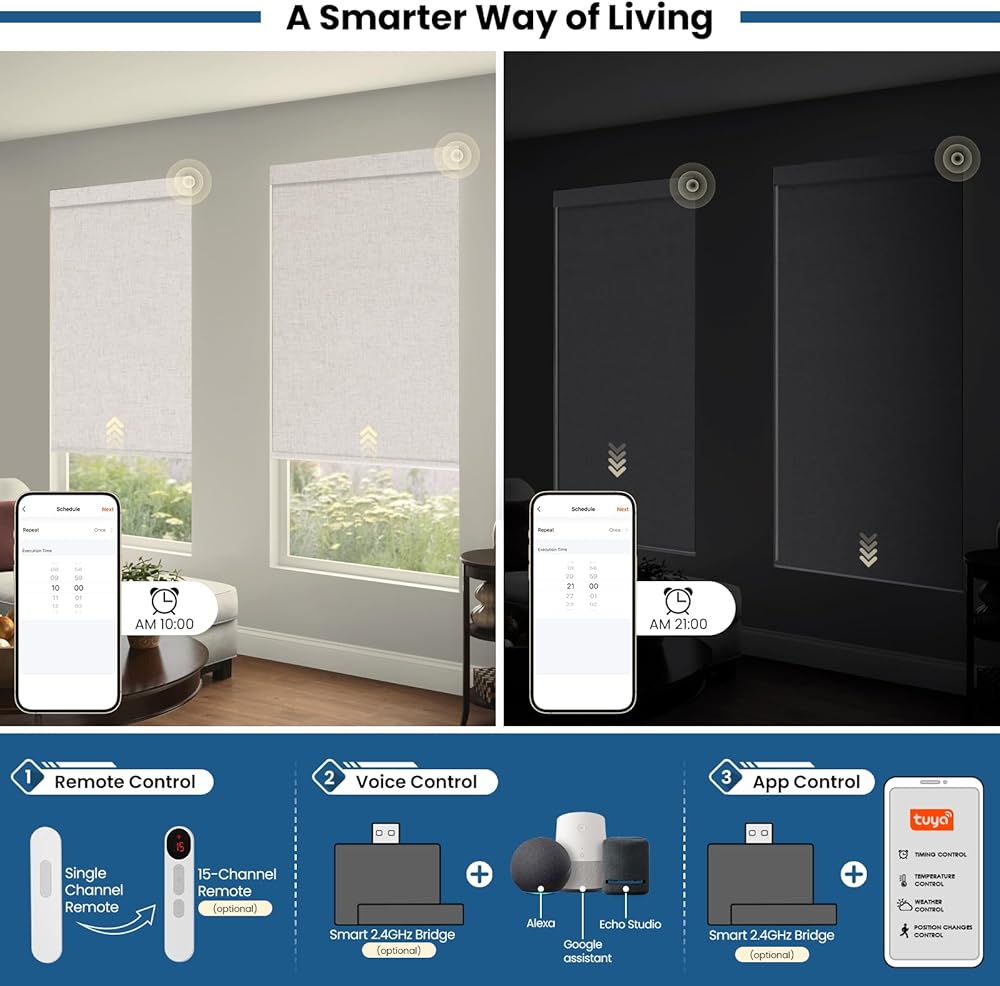الحياة الذكية: تحتوي كل ستارة آلية على جهاز تحكم عن بعد لتشغيل غطاء واحد. للحصول على الراحة في الغرفة بأكملها، قم بالترقية إلى جهاز التحكم عن بعد ذو 15 قناة (غير متضمن) للتحكم في ما يصل إلى 15 درجة لون في وقت واحد. قم بالاقتران مع المحور الذكي (غير متضمن)، افتح وأغلق الستائر الدوارة من هاتفك الذكي أو قم بالتشغيل التلقائي بالكامل عند فتحها وإغلاقها باستخدام الأوامر الصوتية. استمتع بحياة أكثر سهولة!