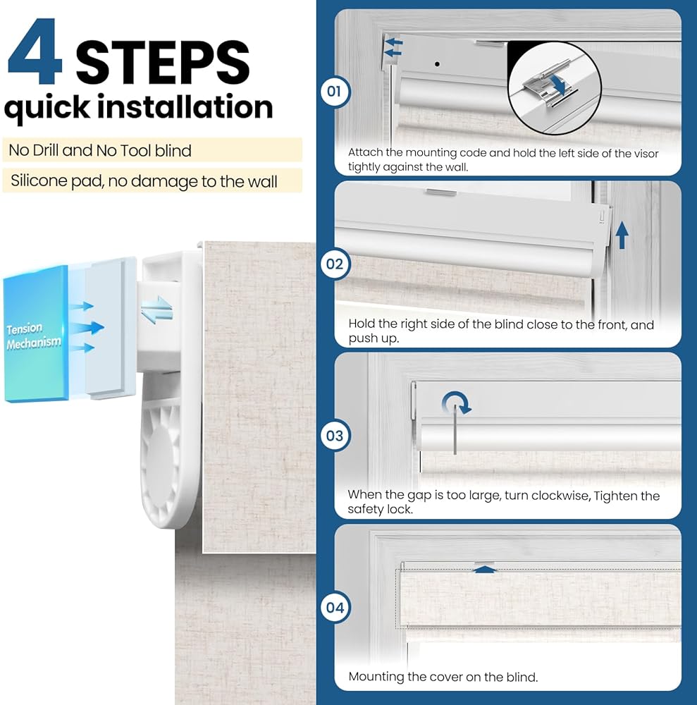 لا توجد أدوات، بدون حفر، سهلة التركيب: سريعة وسهلة التركيب، تعمل هذه الستائر بدون حفر بسلاسة وتحافظ على مظهر نافذتك النظيف. نظرًا لأنك لا تحتاج إلى حفر ثقوب في إطار النافذة أو الجدار، فهذه خيار رائع للمستأجرين أو الأشخاص الذين يرغبون في تجنب التسبب في تلف مساحة معيشتهم.