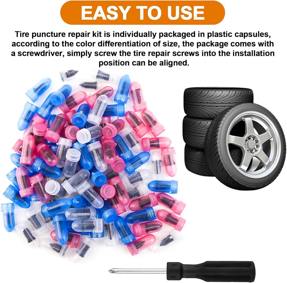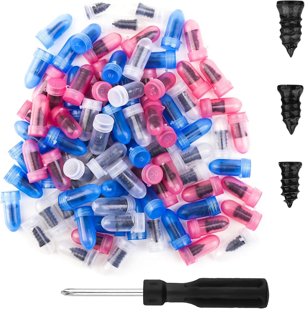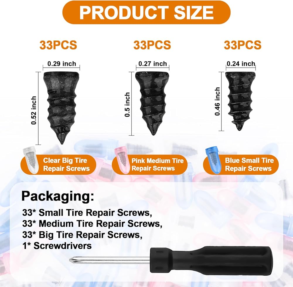 Complete 100PCS Tire Plug Kit – Includes 3 sizes of tire repair screws (33 pieces per size) and 1 screwdriver, enough for multiple tire repairs and emergency use.