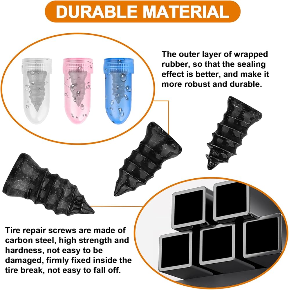 Premium Durable Material – Tire screw plugs are constructed with carbon steel core and rubber coating, sturdy, wear-resistant, and not easy to loosen or fall off.