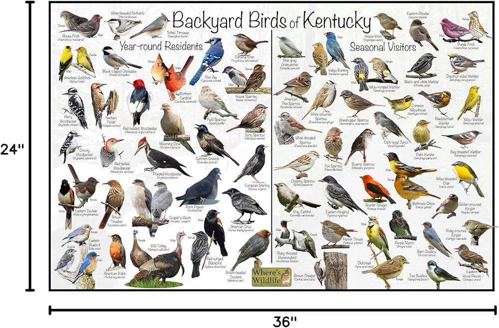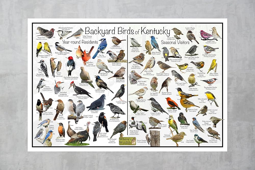 The 'Backyard Birds of Kentucky' poster offers an engaging and educational way to identify common birds right in your backyard. It features two sections: one for year-round residents and another for seasonal visitors. Printed in the U.S.A. on professional-grade HP photo paper, this high-quality poster is both informative and visually appealing.