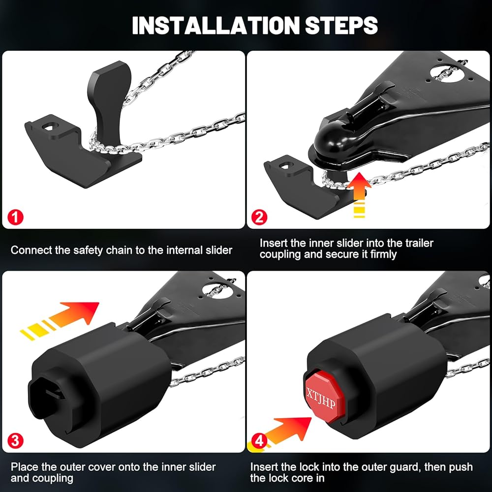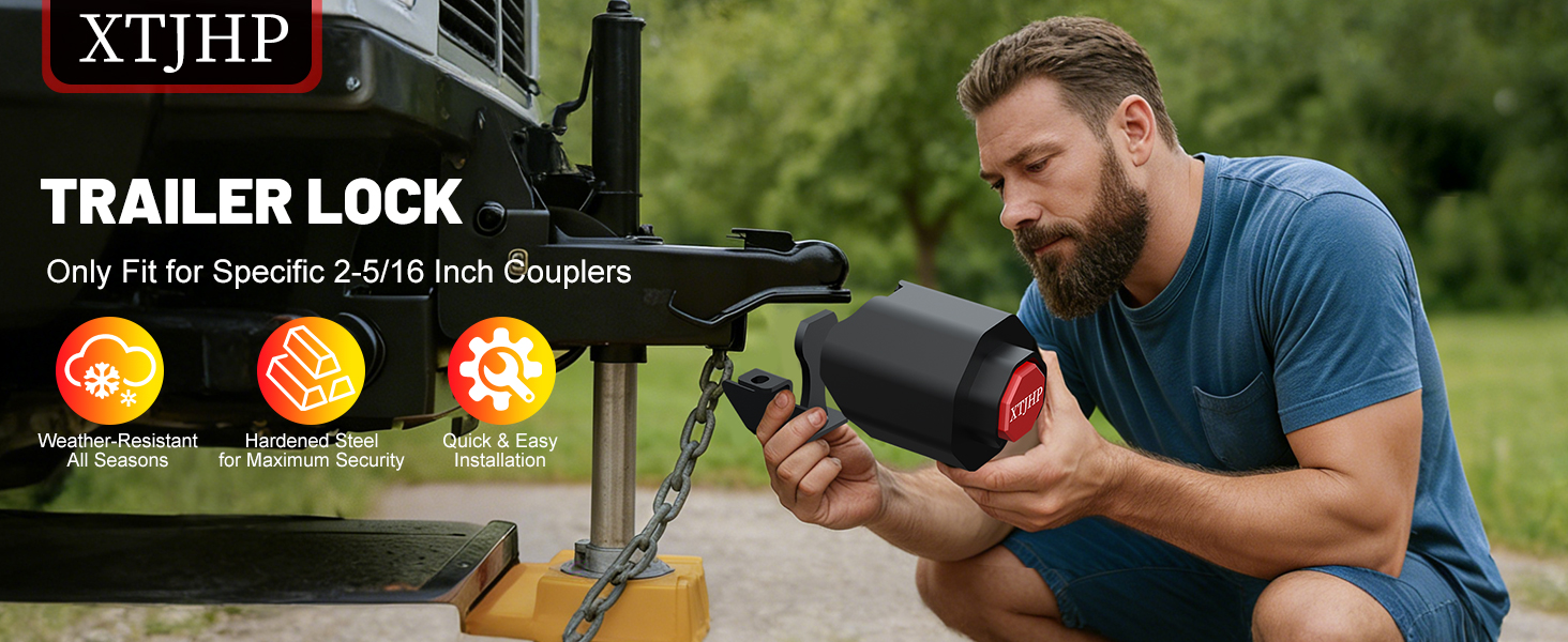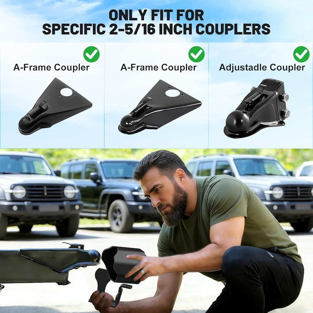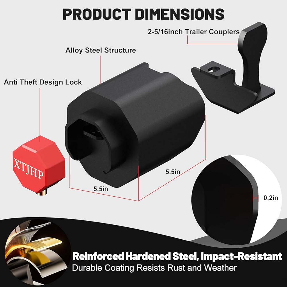 [توافق قفل المقطورة]: أقفال وصلة المقطورة هذه تنطبق فقط على وصلات محددة مقاس 2-5/16 بوصة، يرجى التحقق من أحجام الوصلات المتوافقة مع أجهزة قفل المقطورة الخاصة بنا لضمان التوافق الكامل مع وصلة المقطورة الخاصة بك