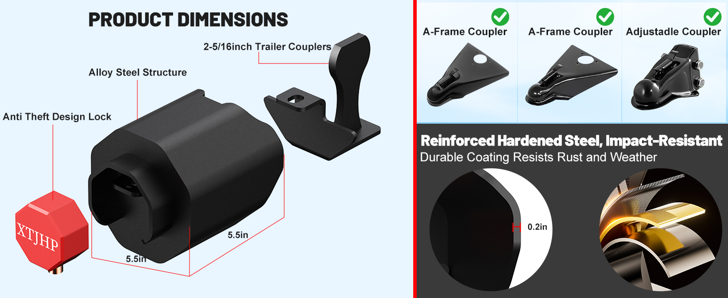[قفل لسان المقطورة الثقيل]: قفل وصلة المقطورة مصنوع من الفولاذ الصلب المقوى، بسمك 0.23 بوصة، مما يضمن المتانة ومقاومة الصدمات. الجزء الخارجي من قفل كرة المقطورة مطلي بطبقة متينة لمقاومة الصدأ والطقس