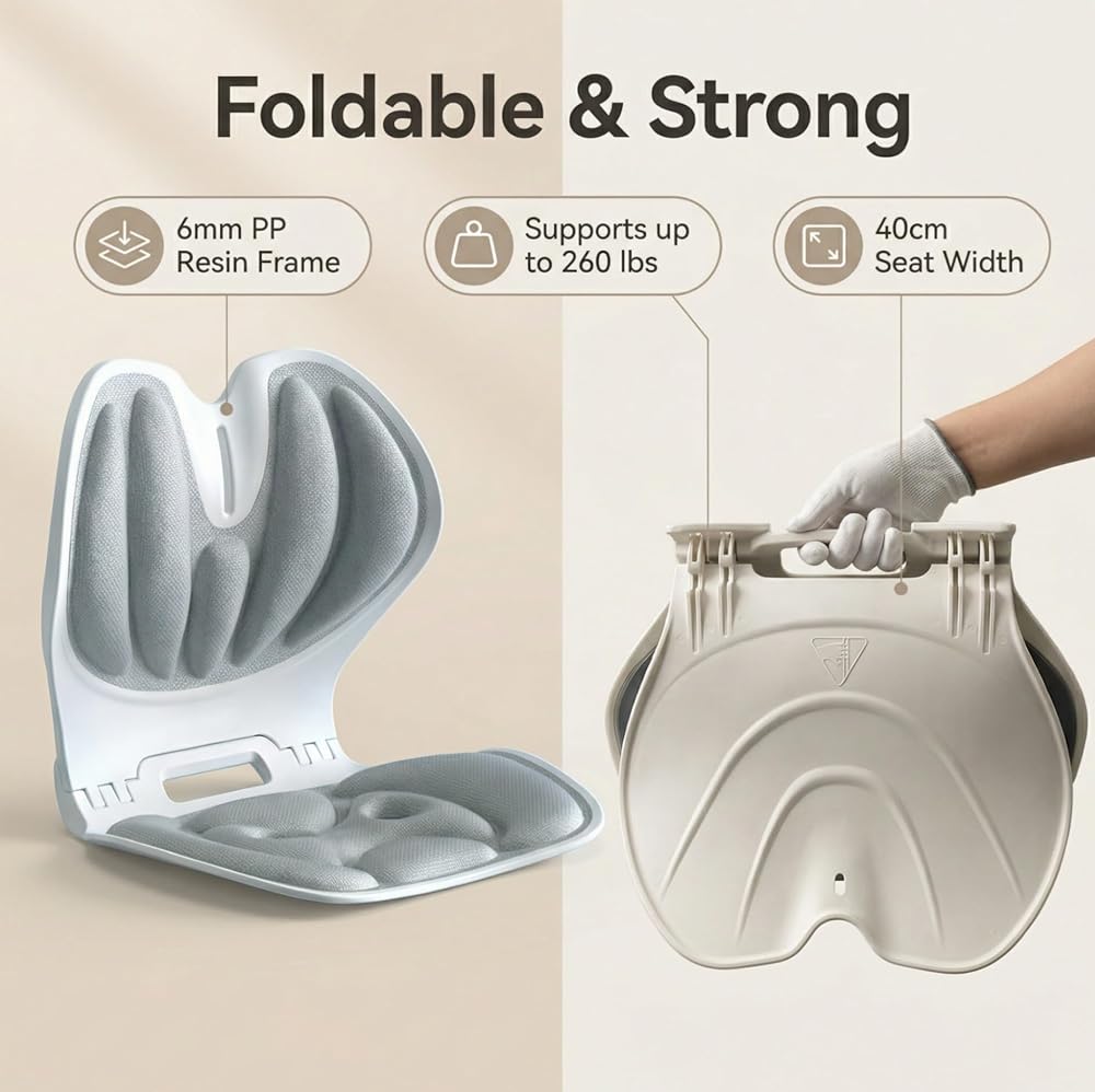 Professional Portable Structural Support Chair Are you tired of ' ergonomic ‘ cushions that flatten into useless pancakes after a month? Stop sinking into soft foam. Upgrade to true structural alignment. The Jarler Portable Posture Chair is not just a seat cushion; it is a precision-engineered sitting instrument designed to combat the "Slouch Epidemic" of modern life. The Difference: Structure Over Softness Most lumbar pillows on the market rely on cheap memory foam that traps heat and loses shape. We took a different approach. We built a "Chair on a Chair." At its core lies a 5mm High-Tensile PP Resin Frame. This heavy-duty skeleton mimics the natural curvature of the human spine, providing 260lbs of ' Zero-Deformation' support. It acts as a lever: when you sit, your body weight pushes the backrest forward, gently propping up your lumbar region and forcing your spine into a healthy, upright S-curve. Why Choose Jarler ? 🦴 Structural Integrity: A hybrid design combining a rigid resin core with a breathable Space Memory Foam top layer. It offers the perfect balance—firm enough to correct posture, comfortable enough for 8-hour shifts. ✈️ Ultra-Portable Back Support Cushion: Why leave your comfort at the office? Our patented folding mechanism collapses this device to a slim 5.5-inch profile. Weighing just 1.25kg (2.7lbs) with a built-in handle, it fits in your car trunk, carry-on luggage, or desk drawer. 🏟️ The Stadium Upgrade: Turn cold, hard bleachers into a VIP experience. Perfect for sports fans who want to enjoy the game without the post-match back stiffness. 🍼 Support for Nursing Moms: A game-changer for postpartum recovery. It transforms sofas and nursery chairs into supportive stations, relieving back strain during long breastfeeding sessions. Technical Specifications: Core Material: 5mm High-Tensile Polypropylene (PP) Resin Surface Material: High-Density Breathable Memory Foam & Wear-Resistant Fabric Weight: 1.25 kg (2.7 lbs) – Lightweight & Travel Ready Folded Thickness: 5.5 inches – Space Saving Weight Capacity: Supports up to 260 lbs Dimensions: 15.7" Width x 14" Depth x 13" Height (Unfolded)