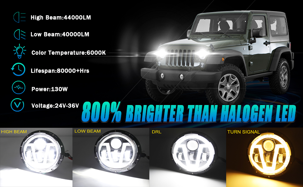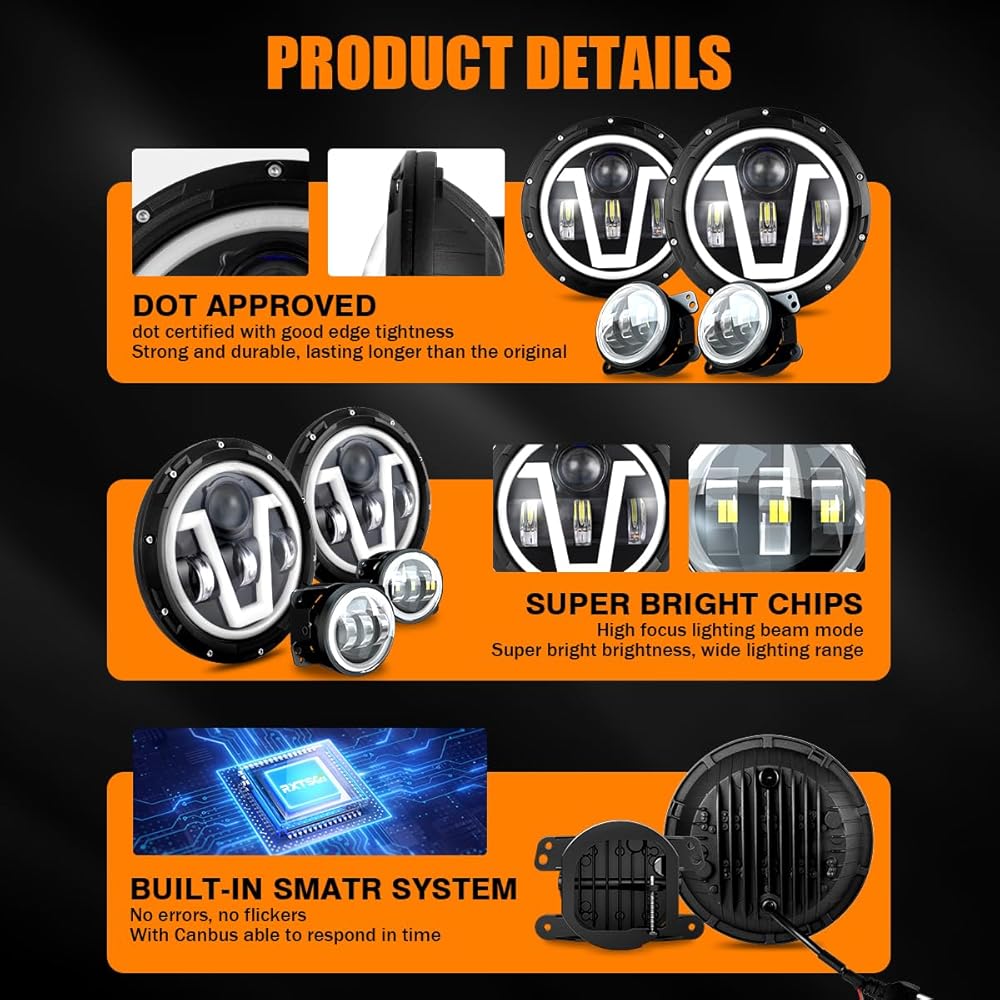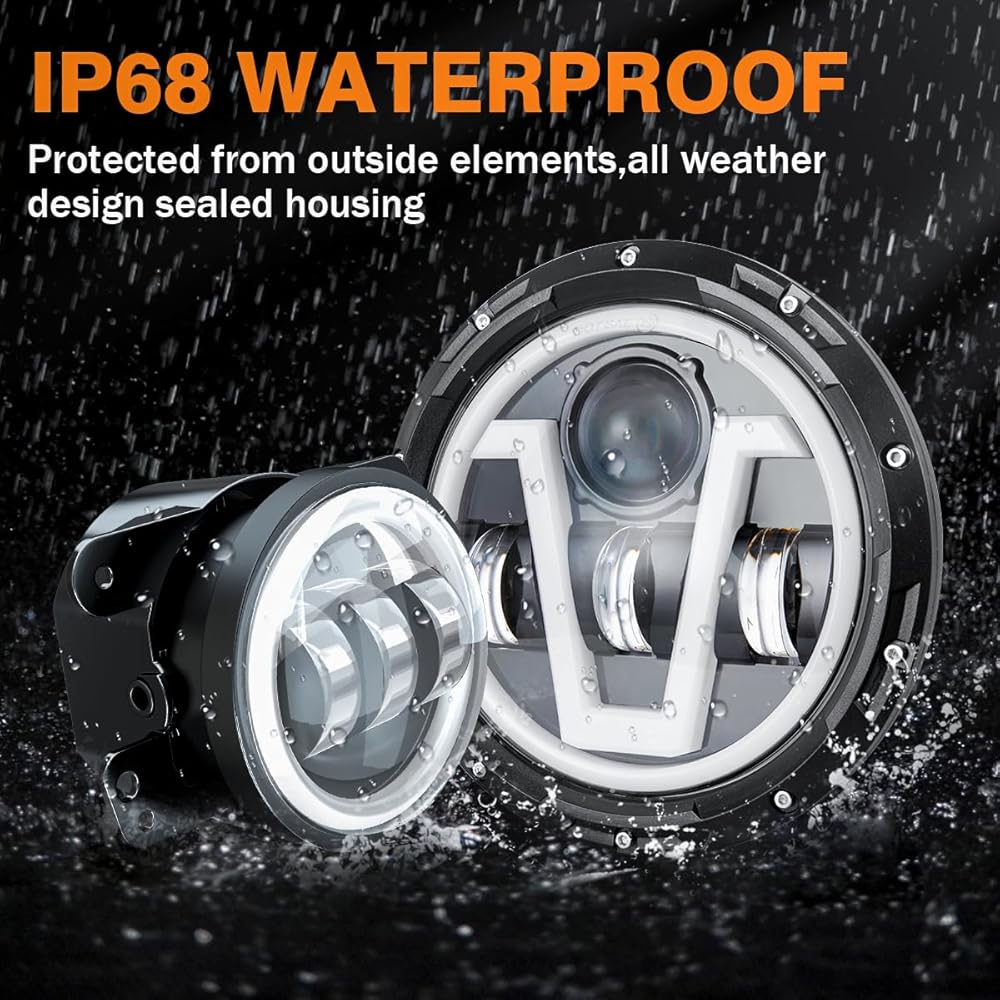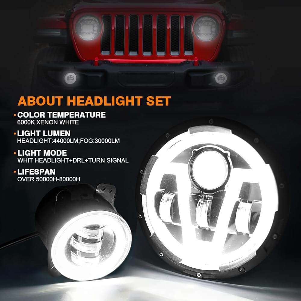 أربعة أوضاع إضاءة: مصابيح أمامية مقاس 7 بوصات مع شعاع عالٍ، شعاع منخفض، إشارات انعطاف كهرمانية، مصابيح تشغيل نهارية بيضاء. بالإضافة إلى ذلك، فهي مجهزة بمصابيح ضباب 30.000 لومن مقاس 4 بوصات، وتتميز بإشارات انعطاف كهرمانية وأضواء تشغيل نهارية بيضاء نقية. تتيح لك مجموعة الإضاءة المطورة القيادة بشكل جيد في الليل، مما يحسن المشكلة السابقة المتمثلة في المصابيح الأمامية غير الواضحة وغير المركزة بشكل كافٍ. وفي الوقت نفسه، سيجعل التصميم الفريد مظهر سيارتك المحبوبة مميزًا.