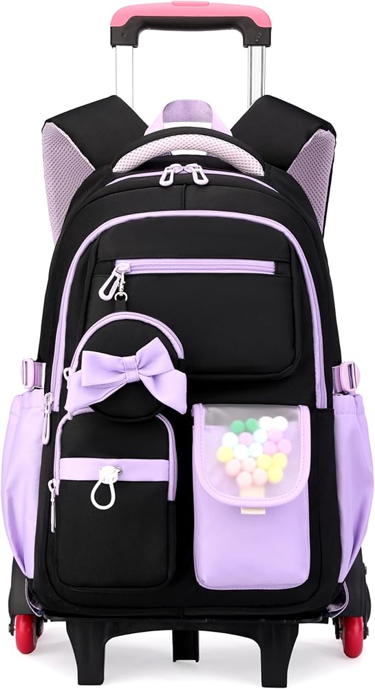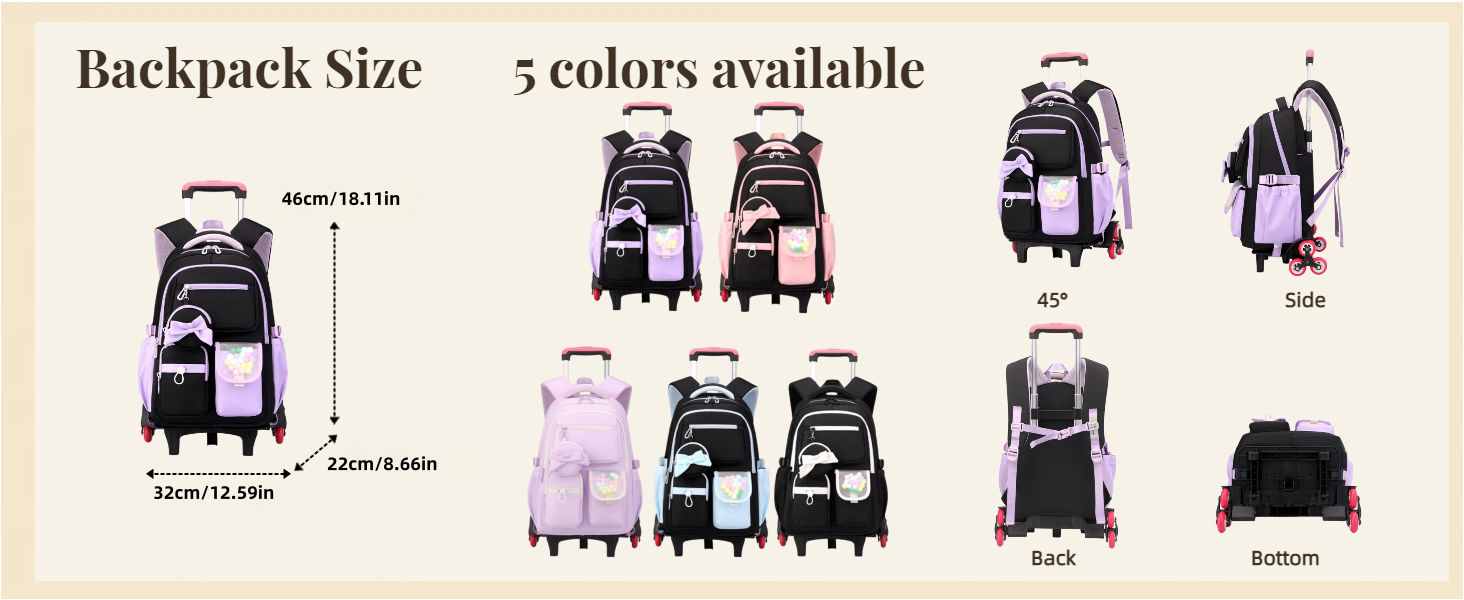 حقيبة ظهر للفتيات بعجلات: حقيبة ظهر للفتيات تتميز بتصميم عصري ولافت للنظر. حقيبة الظهر الدوارة هذه مجهزة بسحابات متينة وناعمة وعجلات مقاومة للاهتراء ومقبض معدني قابل للسحب ولوحة دعم قابلة للطي، وهي مصممة لتلبية الاحتياجات المتنوعة للطلاب في كل مرحلة. وتتميز حقيبة الظهر الدوارة للأطفال بتصميم 2 في 1: يمكن استخدامها ليس فقط كحقيبة دوارة بعجلات ولكن أيضًا كحقيبة ظهر عادية بعد إزالة القاعدة.