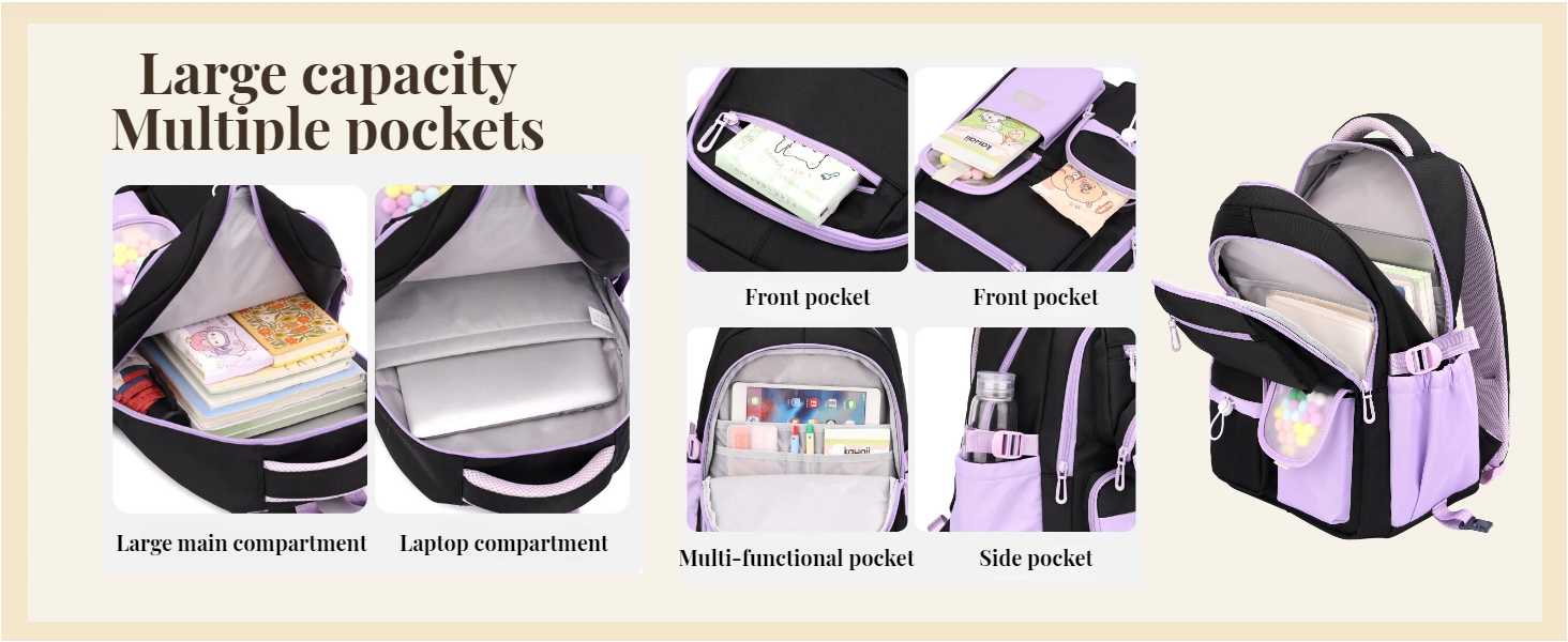 حقيبة ظهر للفتيات خفيفة الوزن مع مساحة تخزين من 6 طبقات، بما في ذلك جيب رئيسي كبير السعة، وجيب ثانوي، وثلاثة جيوب أمامية، وجيبين جانبيين، وجيب خلفي مضاد للسرقة. بالإضافة إلى ذلك، فهي مجهزة بمحفظة عملات معدنية قابلة للفصل. يساعد تصميم المقصورة متعدد الوظائف الأطفال على تطوير عادات تنظيمية جيدة.
