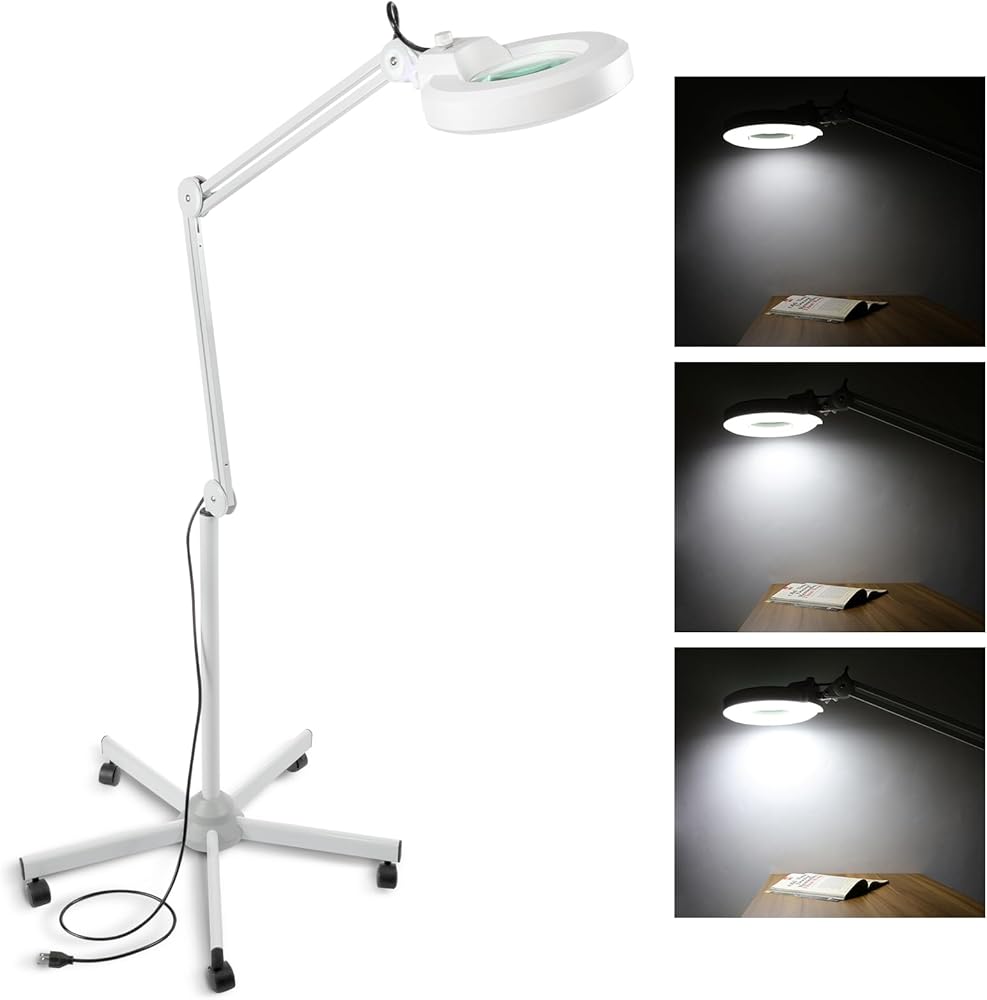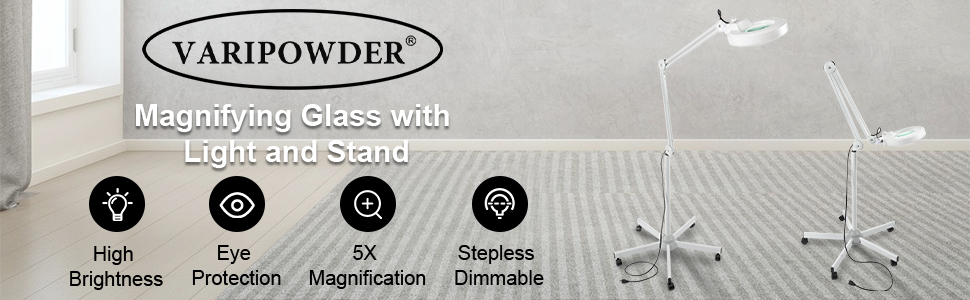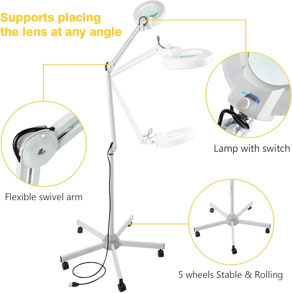 عدسة مكبرة VARIPOWDER 5X مع ضوء وحامل، مصباح أرضي مكبر مع 5 عجلات متدحرجة، مصباح أرضي لأخصائيي التجميل للوجه، وصلات رموش عمل قابلة للتعتيم، الخياطة، العمل القريب، الحرف اليدوية