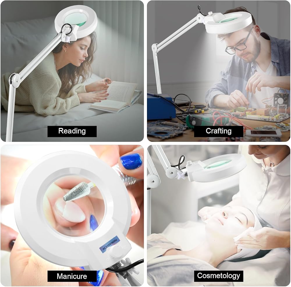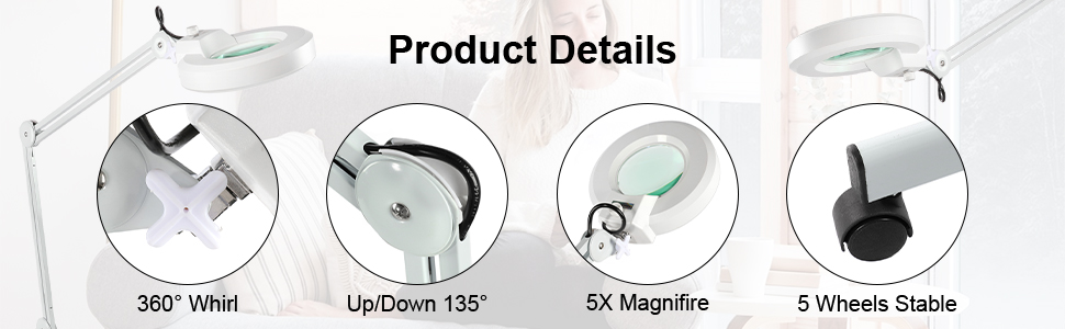 [مصباح أرضي ماج قابل للتعديل]: يمكنك إما استخدامه كمصباح أرضي زجاجي مكبر LED. تحتوي أفضل قاعدة دوارة على 5 عجلات حيث أنها تتدحرج بسهولة على السجاد والأرضيات وتتمتع بأفضل ثبات. يمكن للعدسة أن تدور إلى اليسار واليمين بزاوية 360 درجة وتقلب لأعلى ولأسفل 180 درجة، ما عليك سوى ضبط المصباح المكبر حسب احتياجاتك لتحرير كلتا يديك للعمل.