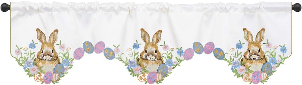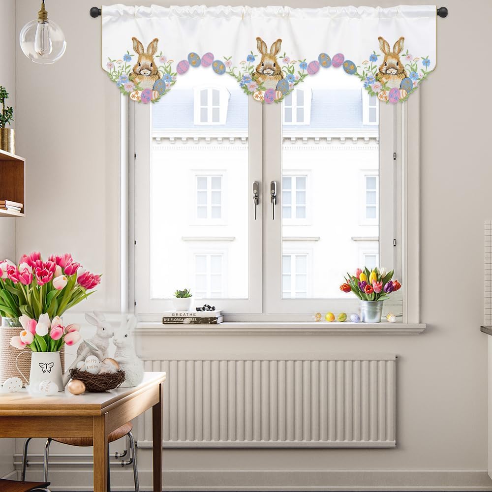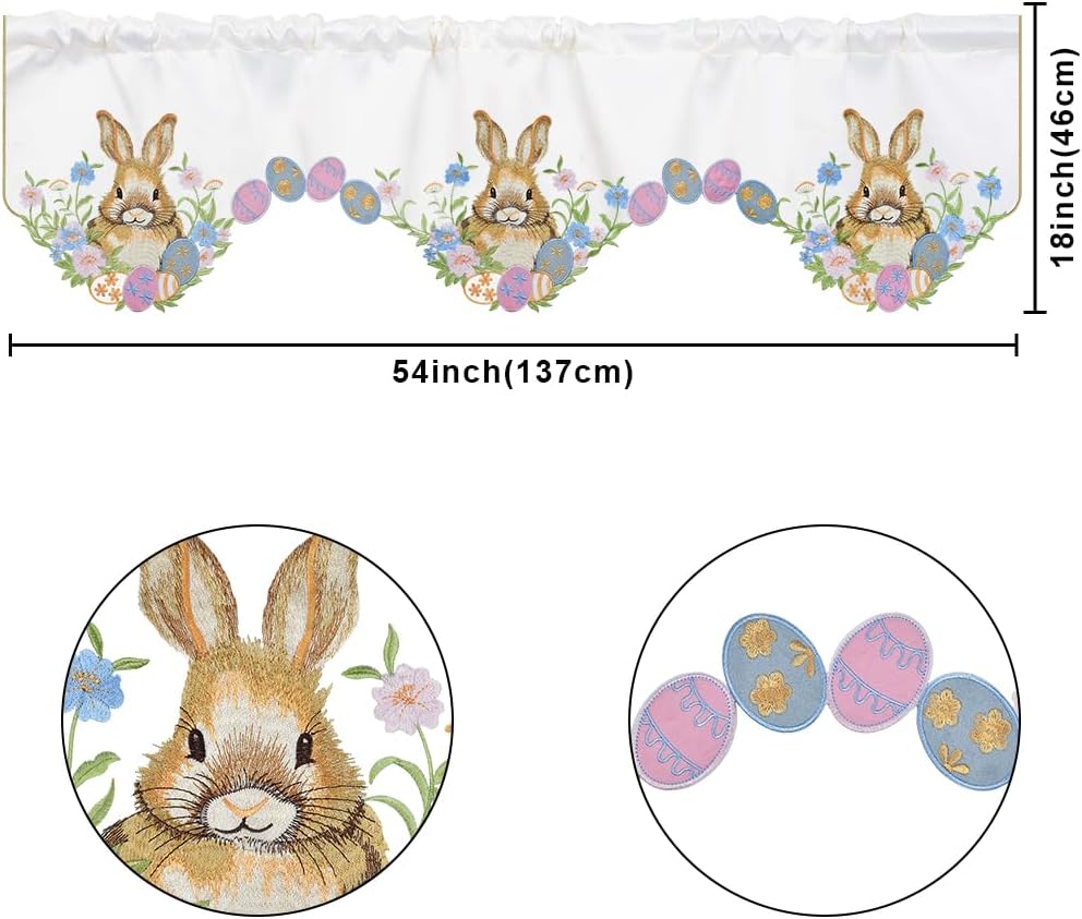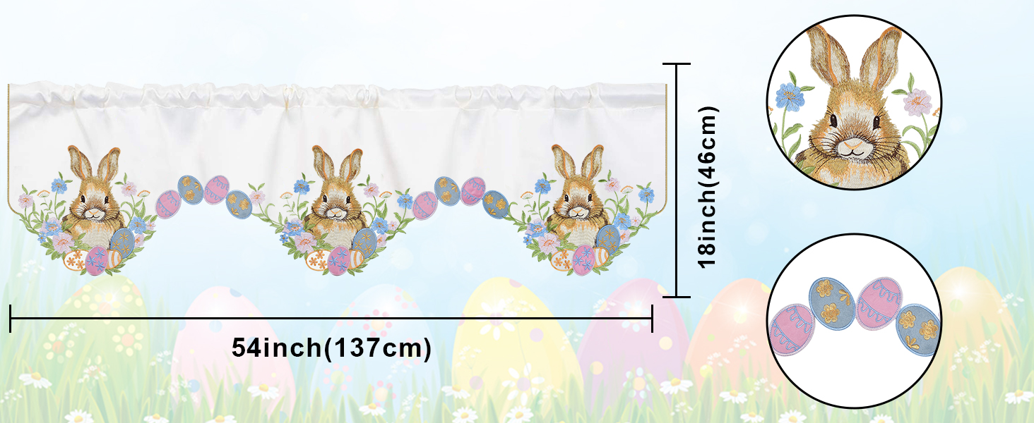 المقاس المثالي: نقدم ستارة مطبخ عيد الفصح للنافذة بمقاس حوالي 58 × 14 بوصة / 147 × 35 سم. سهلة التركيب، يوجد جيب عمود في الأعلى، وهو مناسب لتعليق ستائر النافذة.
