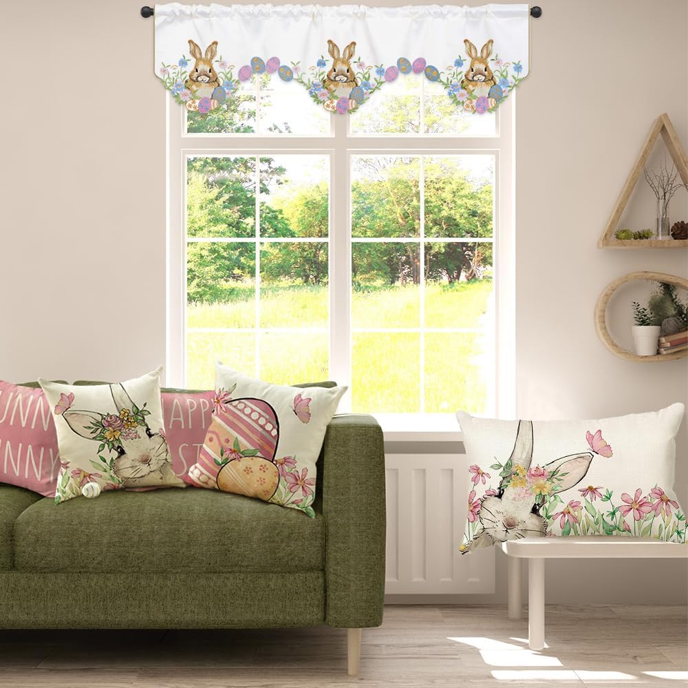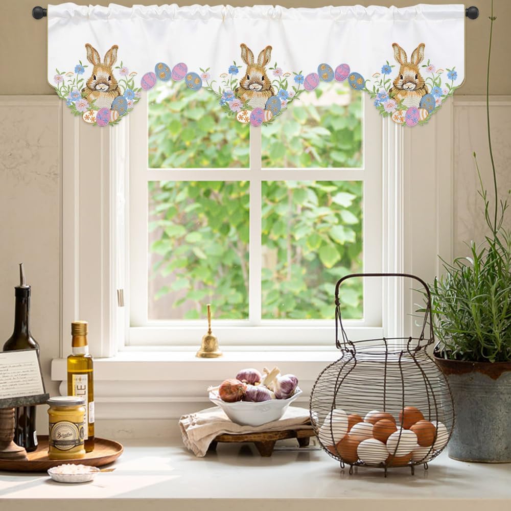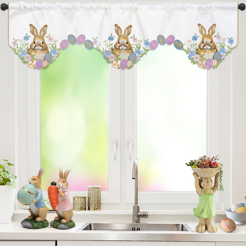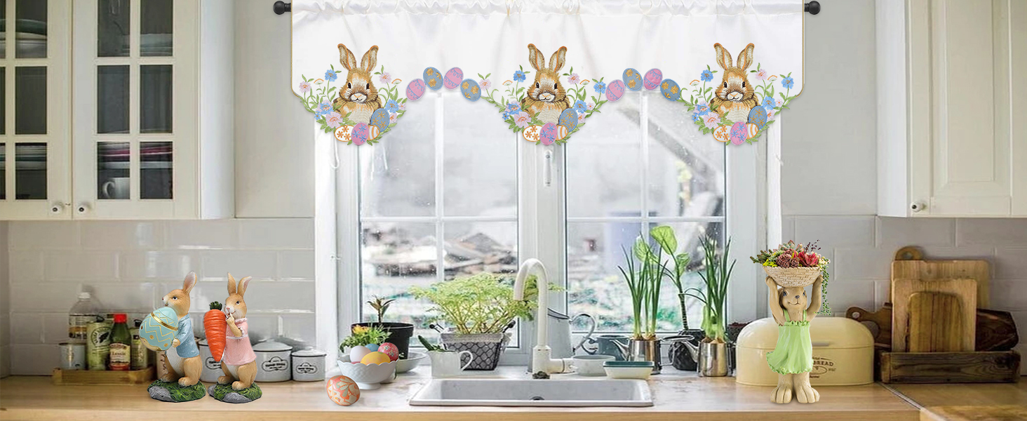 المقاس المثالي: نقدم ستارة مطبخ عيد الفصح للنافذة بمقاس حوالي 58 × 14 بوصة / 147 × 35 سم. سهلة التركيب، يوجد جيب عمود في الأعلى، وهو مناسب لتعليق ستائر النافذة.