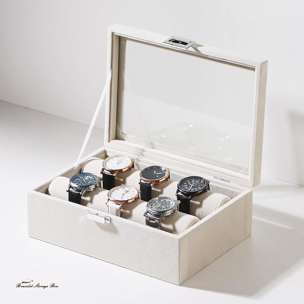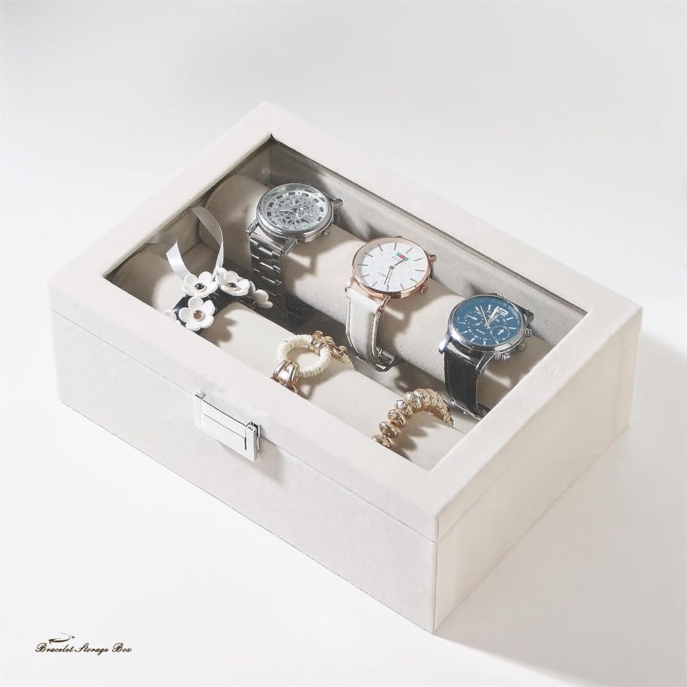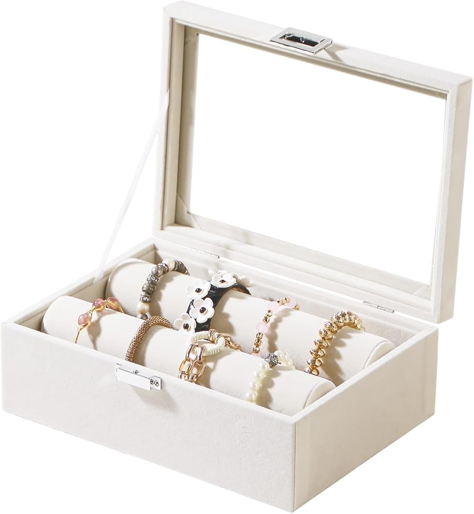 حامل عرض الأساور مع قضبان لأساور الساعات، صندوق تخزين منظم المجوهرات مع غطاء شفاف (بيج)