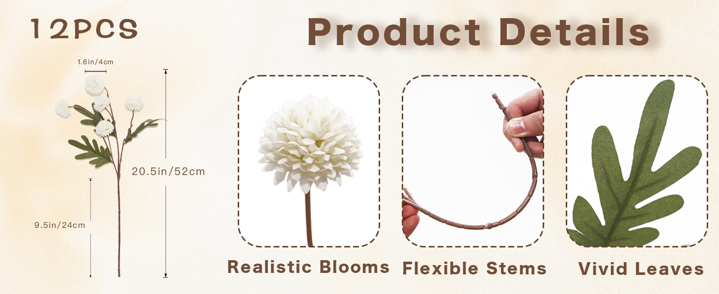 الحجم المثالي: تحتوي هذه المجموعة على 12 سيقان أقحوان صناعية، كل منها بها 5 أزهار صغيرة، بإجمالي 60 زهرة حريرية. يبلغ مقاس كل زهرة 1.6 سم مع سيقان 20.5 سم، مما يخلق شاشة كاملة ونابضة بالحياة تعزز أي غرفة على الفور.