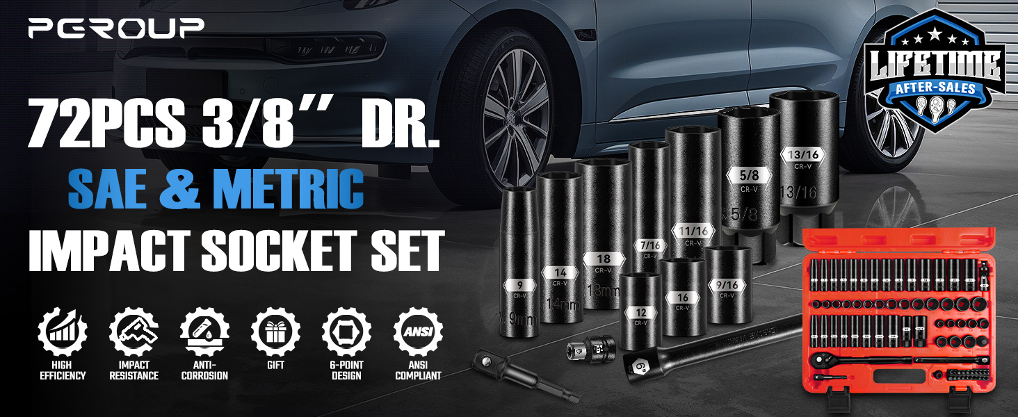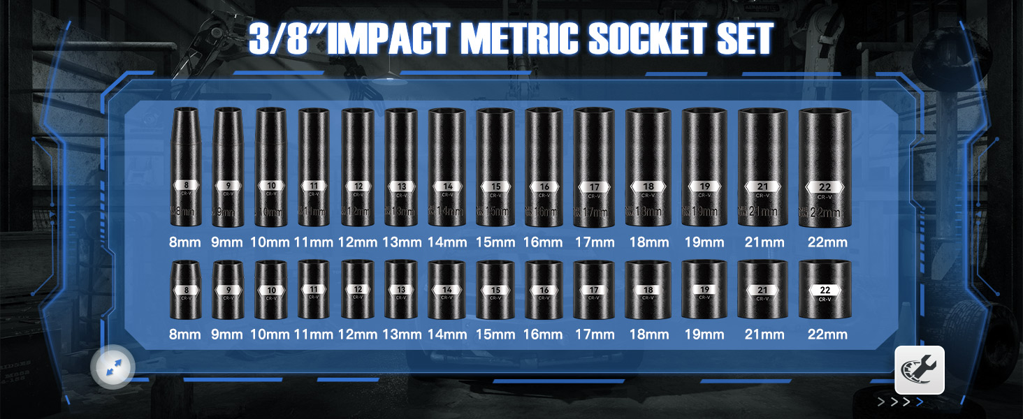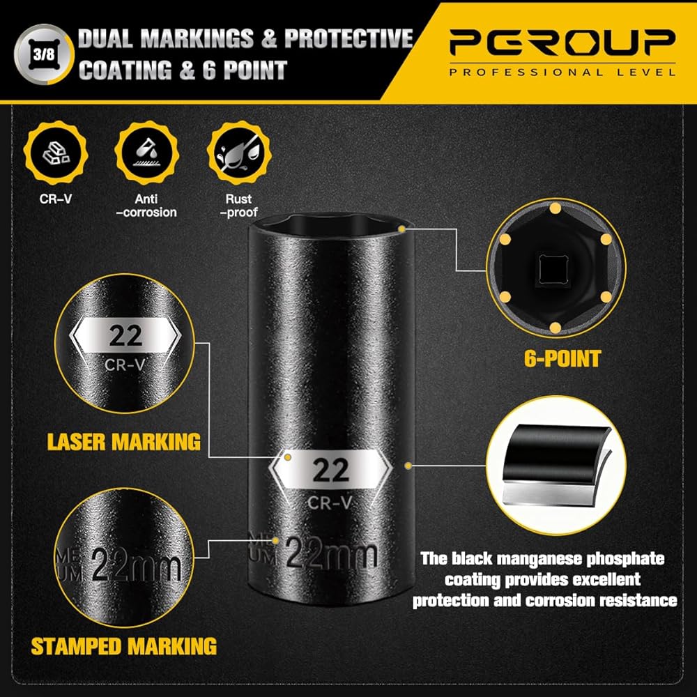 مادة فولاذية فاخرة CR-V: مجموعة مقابس الصدمات 3/8 مصنوعة من مادة CR-V شديدة التحمل، مع تقنية طلاء الفوسفات الأسود، مما يجعل مجموعة المقبس مترية ومعيارية كاملة تتمتع بصلابة عالية ومتانة ومقاومة للصدأ والتآكل، ويمكنها تحمل الحد الأقصى القياسي 1.5 مرة من عزم الدوران الناتج عن أداة التأثير.