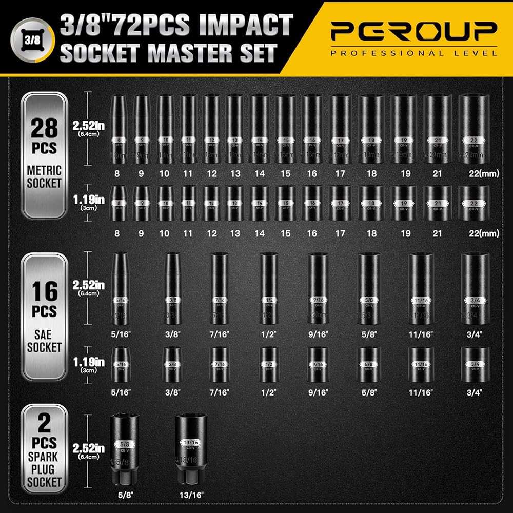 مجموعة مقابس محرك 3/8 بوصة، 72 قطعة معيار SAE (5/16 بوصة - 3/4 بوصة) ومتري (8-22 مم) مع شمعة إشعال، 6 نقاط عميقة وضحلة، مجموعة أدوات سقاطة مفتاح الربط 72T، Cr-V مع حقيبة تخزين شديدة التحمل