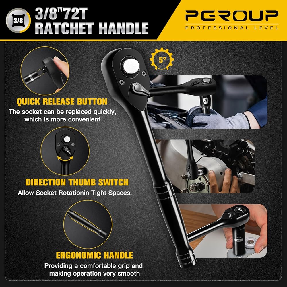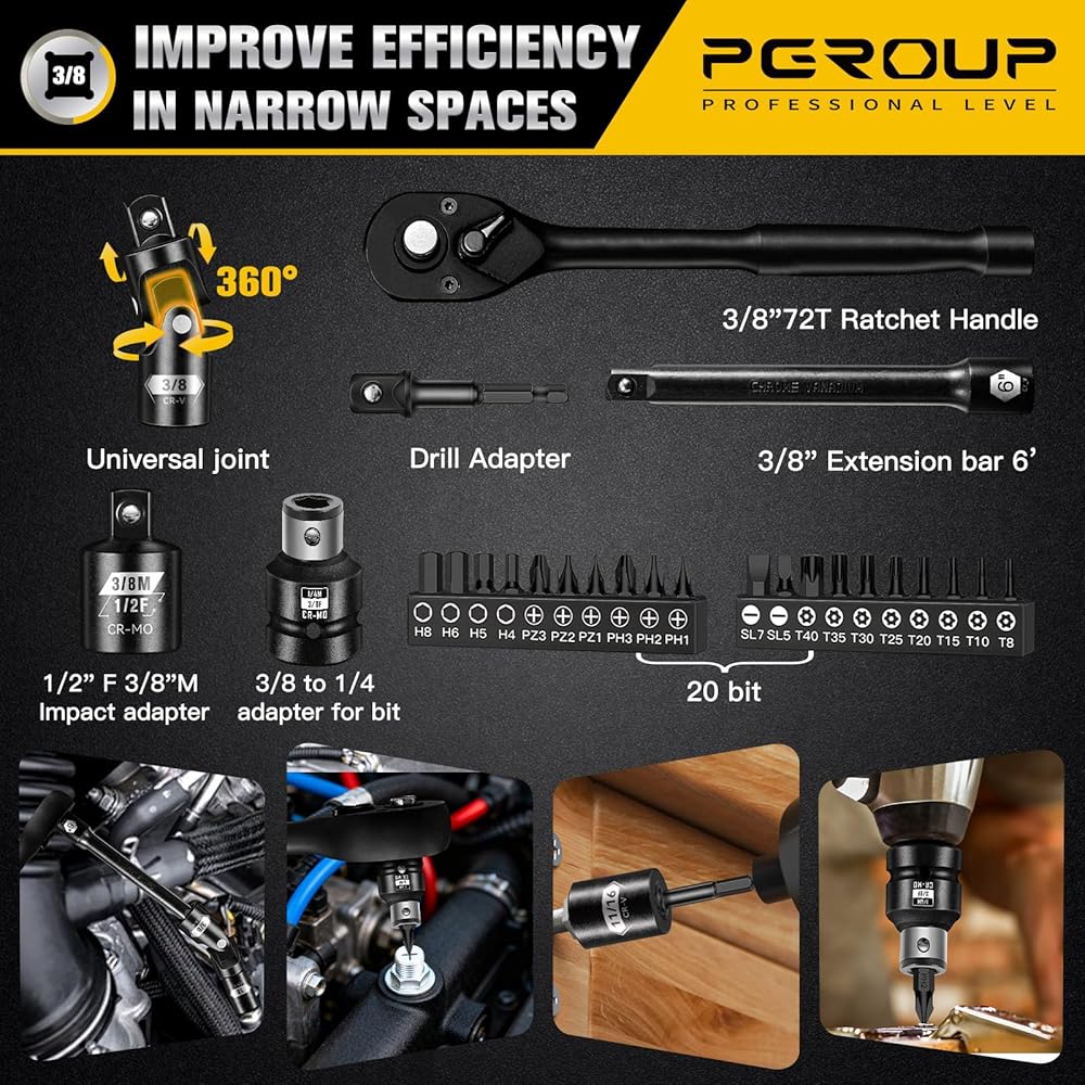 ملحقات مجموعة مقابس 3/8 بوصة: 2x مقبس توصيل الإشعال SAE: 13/16، 5/8 بوصة؛ 1 × 3/8 بوصة بطول 6 بوصة مقبض سقاطة سريع التحرير 72 سنًا؛ شريط تمديد 1 × 6 بوصة؛ 1 × 1/2 بوصة إلى 3/8 بوصة محول مقبس؛ 1 × وصلة عالمية؛ 1 × محول لقمة الحفر؛ 1 × 3/8 محرك مربع إلى محول مقبس سداسي 1/4؛ 20 قطعة لأدوات الطاقة، يستخدم في مختلف المساحات المعقدة، الوصول الدقيق يوفر الوقت والجهد