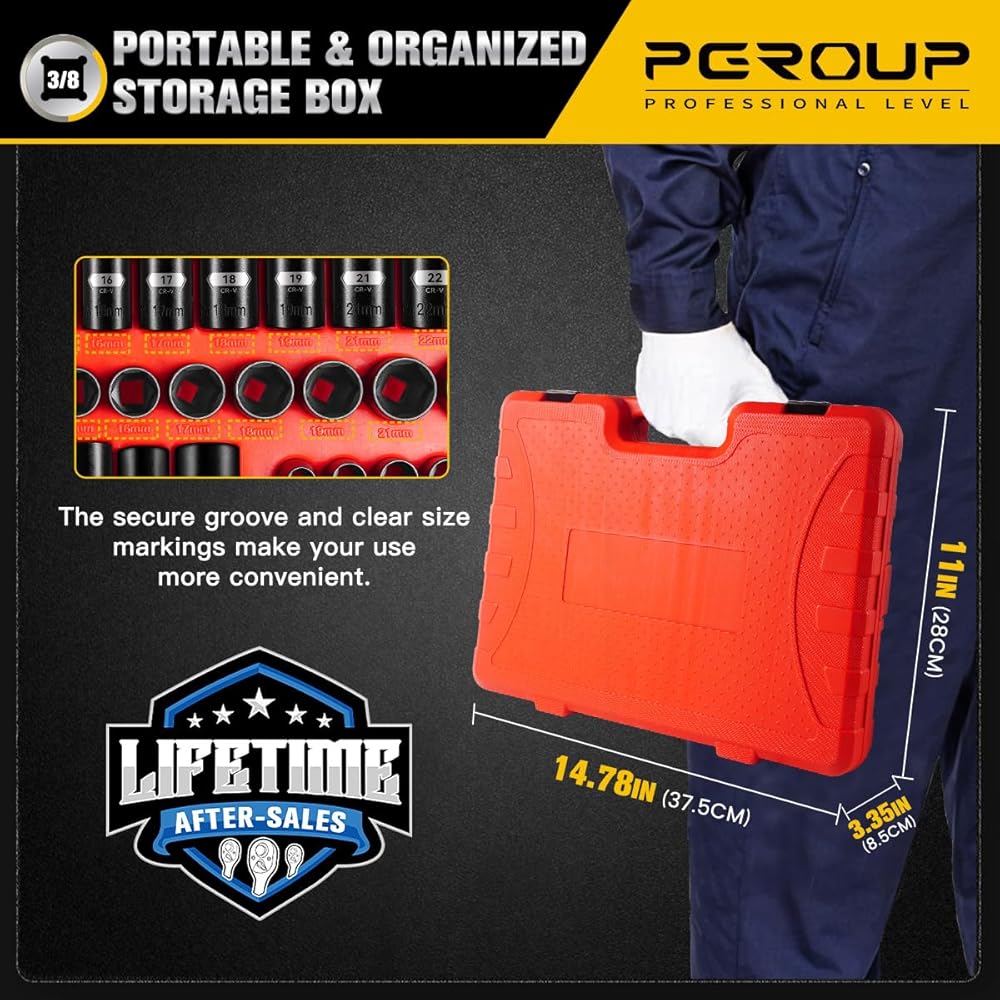 مقبس مريح وصندوق تخزين: يحتوي مقبس المحرك 3/8 على ختم دائم عالي الوضوح وعلامات ليزر، مما يجعل من السهل التعرف عليه عند الاستخدام ويصعب تلفه. يحتوي صندوق التخزين المريح على علامات حجم لتحديد الهوية على المدى الطويل