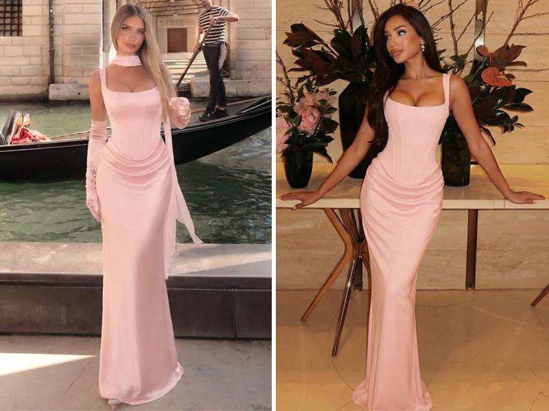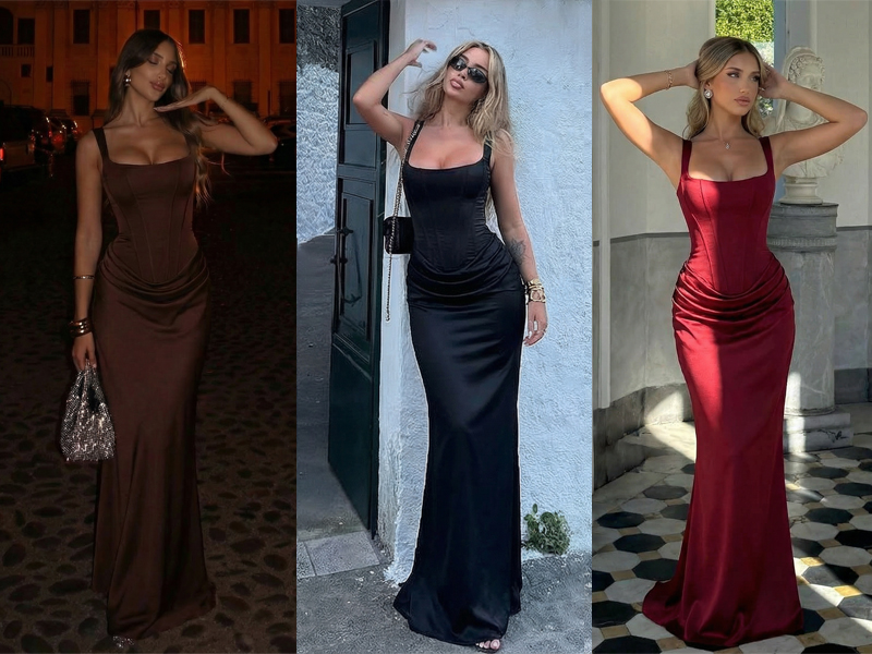 التصميم: ساتان عالي الجودة، حورية البحر، مشد، خصر منسدل، رقبة مربعة، مطوي، مكشكش، طويل، طول الأرض، ضيق، مبطن بالكامل، ظهر برباط، حمالة صدر مدمجة