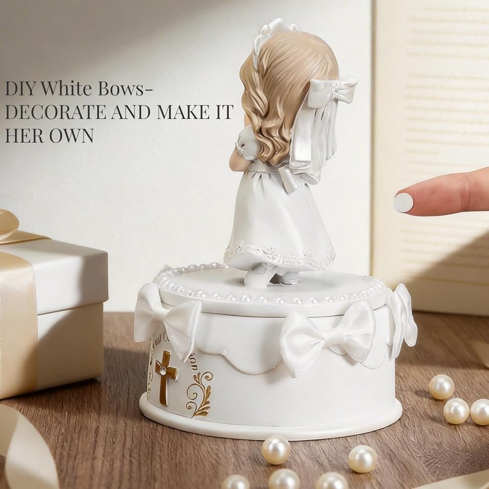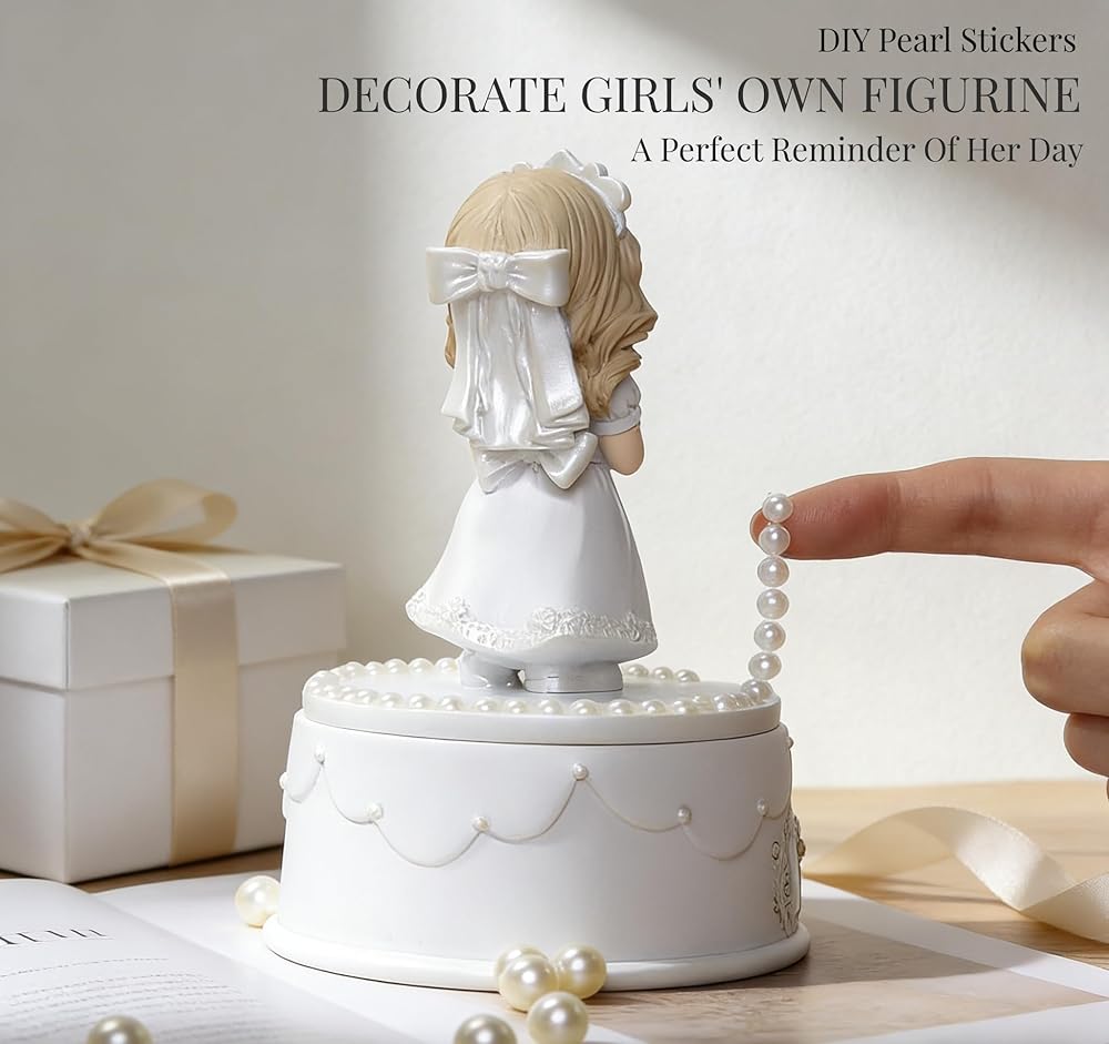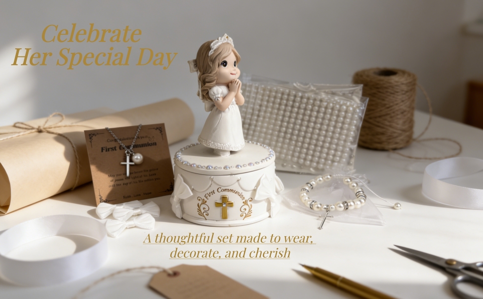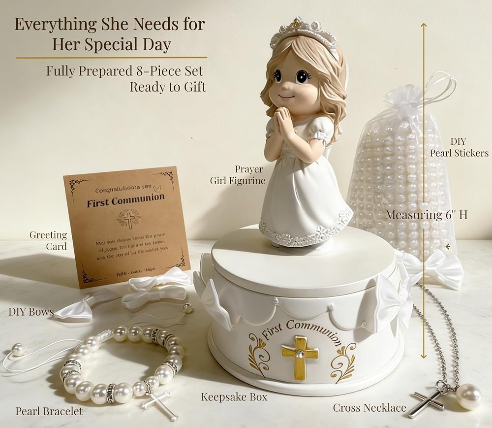 مجموعة جاهزة للهدايا مكونة من 8 قطع - كل شيء متضمن: (1) تمثال فتاة المناولة المقدسة، (1) صندوق تذكار، (1) سوار من اللؤلؤ الأبيض، (1) قلادة متقاطعة، (1) بطاقة تهنئة، (2) ملصقات لؤلؤية DIY و (1) مجموعة أقواس DIY
