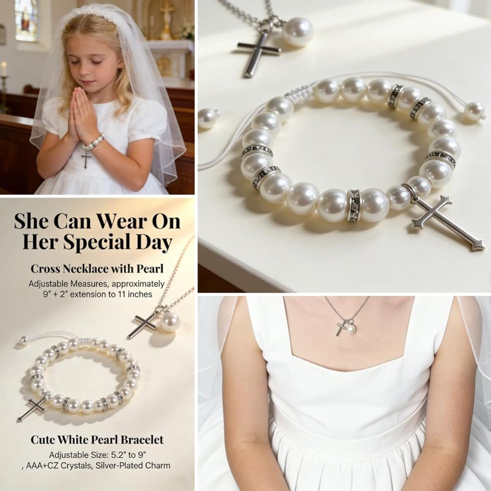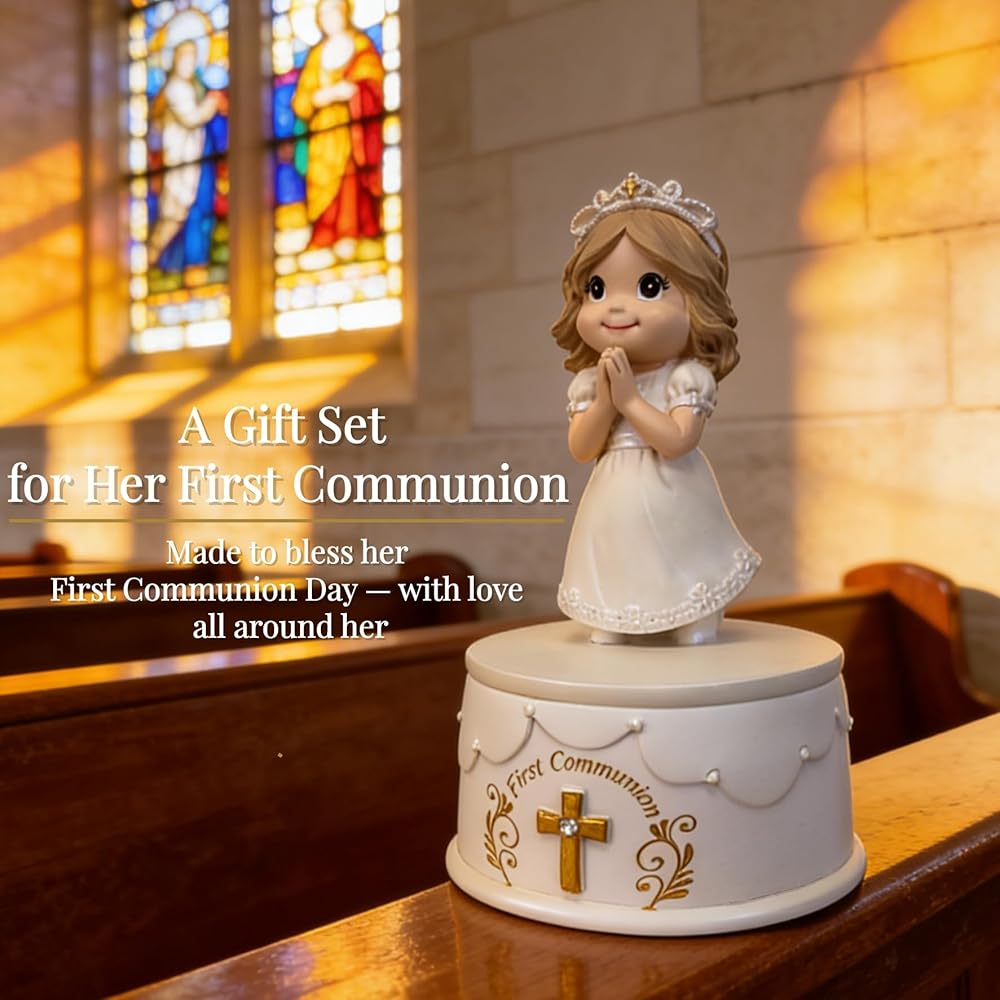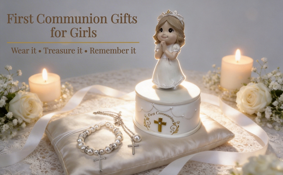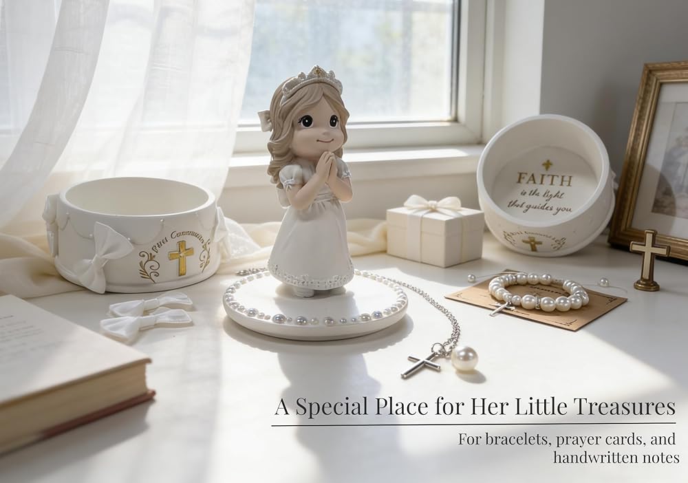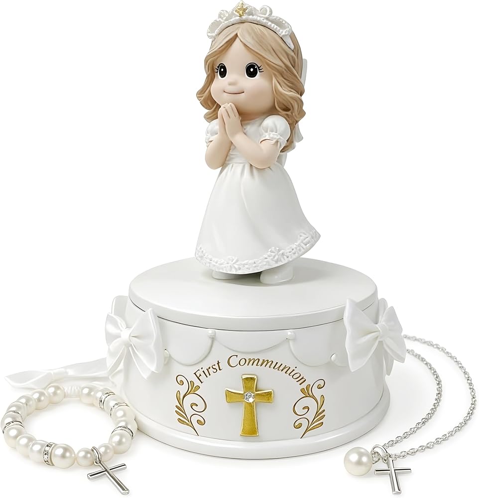 مجموعة جاهزة للهدايا مكونة من 8 قطع - كل شيء متضمن: (1) تمثال فتاة المناولة المقدسة، (1) صندوق تذكار، (1) سوار من اللؤلؤ الأبيض، (1) قلادة متقاطعة، (1) بطاقة تهنئة، (2) ملصقات لؤلؤية DIY و (1) مجموعة أقواس DIY