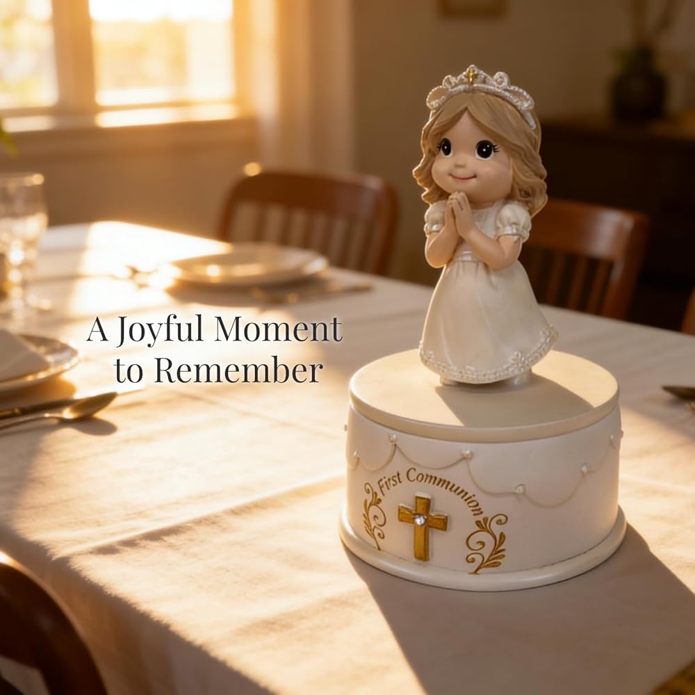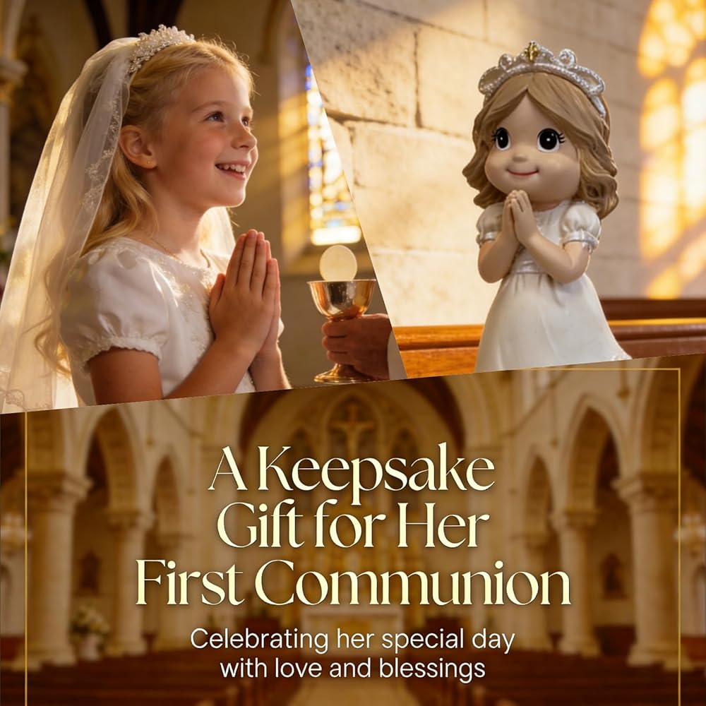 تمثال فتاة الصلاة الذي يعكس اللحظة - الأيدي في الصلاة، فستان أبيض بالكامل والحجاب، تفاصيل لامعة ولمسات لؤلؤية تضفي عمقًا على التمثال. هذا تذكير مثالي ليومها!
