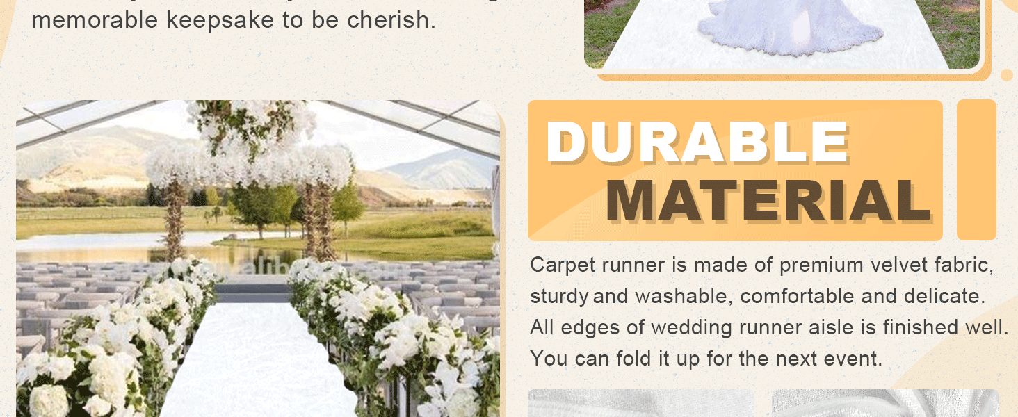 • ❤خامة عالية الجودة - سجادة ممر الزفاف: سجادة ممر الزفاف مصنوعة من نسيج مخملي فاخر، ملمس ناعم ومريح، سميك ومتين. يختلف عن سجاد الممر التقليدي، فإن ممر عداء حفلات الزفاف الخاص بنا في الداخل لن يتمزق أو يتمزق. يعد عداء ممر حفل الزفاف طريقة جميلة لجعل الخطوة الأولى من حفل الزفاف أكثر إثارة.