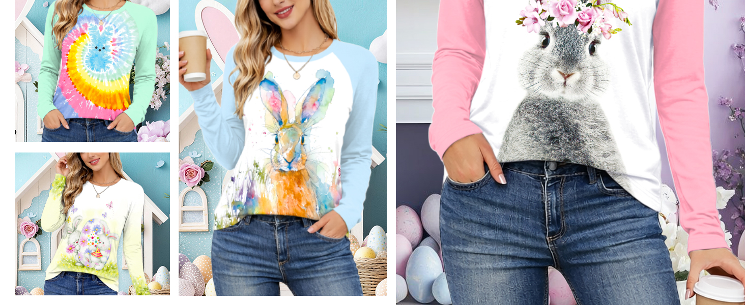 المزايا: تصميم بياقة دائرية وأكمام طويلة لملاءمة كلاسيكية متعددة الاستخدامات يسهل ارتداؤها وخلعها. مصنوع بطبعات تحمل طابع عيد الفصح، ويمكن ارتداؤه بسهولة مع الجينز أو السراويل الضيقة أو السراويل القصيرة أو التنانير أو السترات