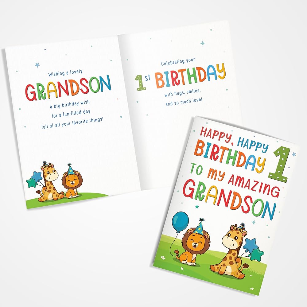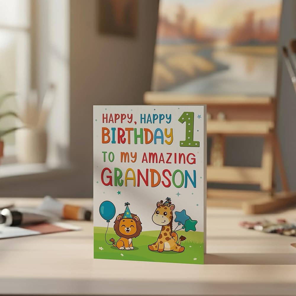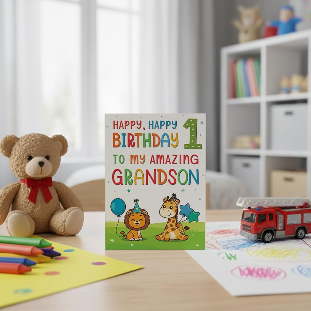 بطاقات عيد الميلاد الأول للحفيد - تصميم حيوان الغابة اللطيف - بطاقة تهنئة مميزة بحجم A5 في المملكة المتحدة