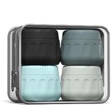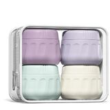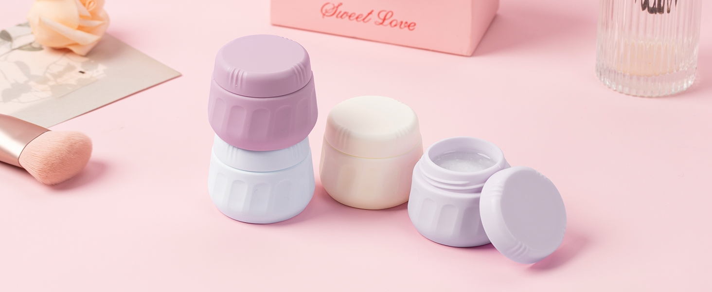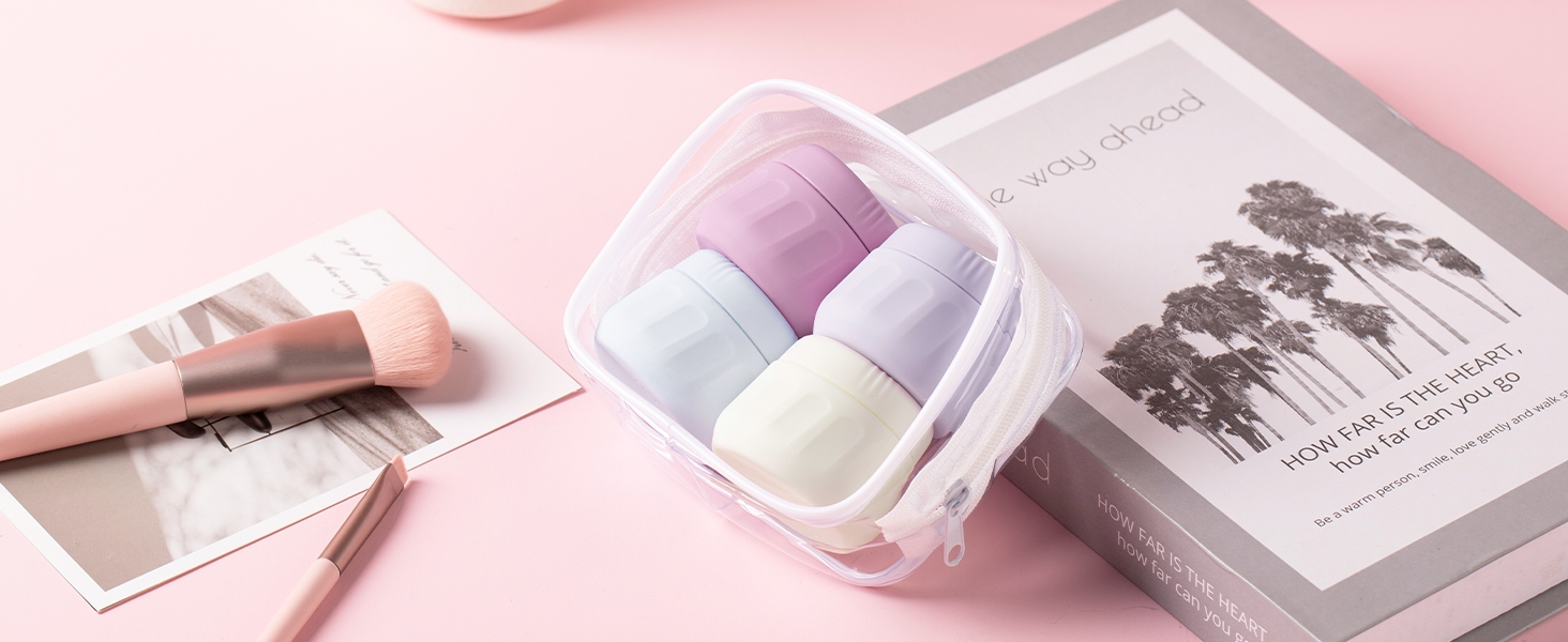 مجموعة أساسيات السفر: تتضمن 4 مرطبانات كريم من السيليكون مع أغطية بلون مطابق لمظهر أنيق، بالإضافة إلى حقيبة مستحضرات تجميل شفافة. مصمم خصيصًا للسفر، فهو سهل الحمل وخفيف الوزن وعملي للغاية.