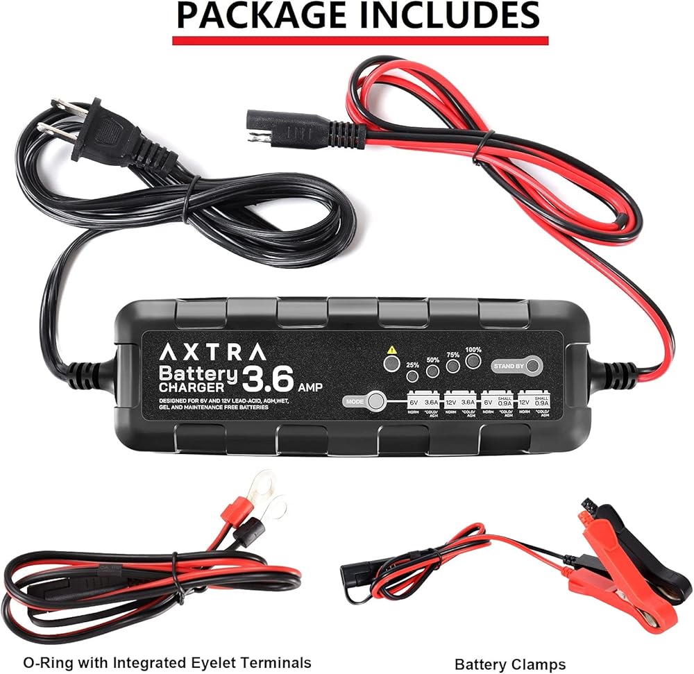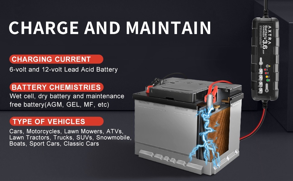 توافقات البطارية: تعمل مع جميع أنواع بطاريات الرصاص الحمضية 6 فولت و12 فولت (الرطبة، MF، الجل، AGM) للسيارات والبحرية وبطاريات الدورات العميقة، بما في ذلك البطاريات المغمورة والجيلية وAGM والبطاريات التي لا تحتاج إلى صيانة. لسعة البطارية 14 أمبير - 120 أمبير (3.6 أمبير بحد أقصى)، و1.2 أمبير - 14 أمبير (منخفض 0.9 أمبير)