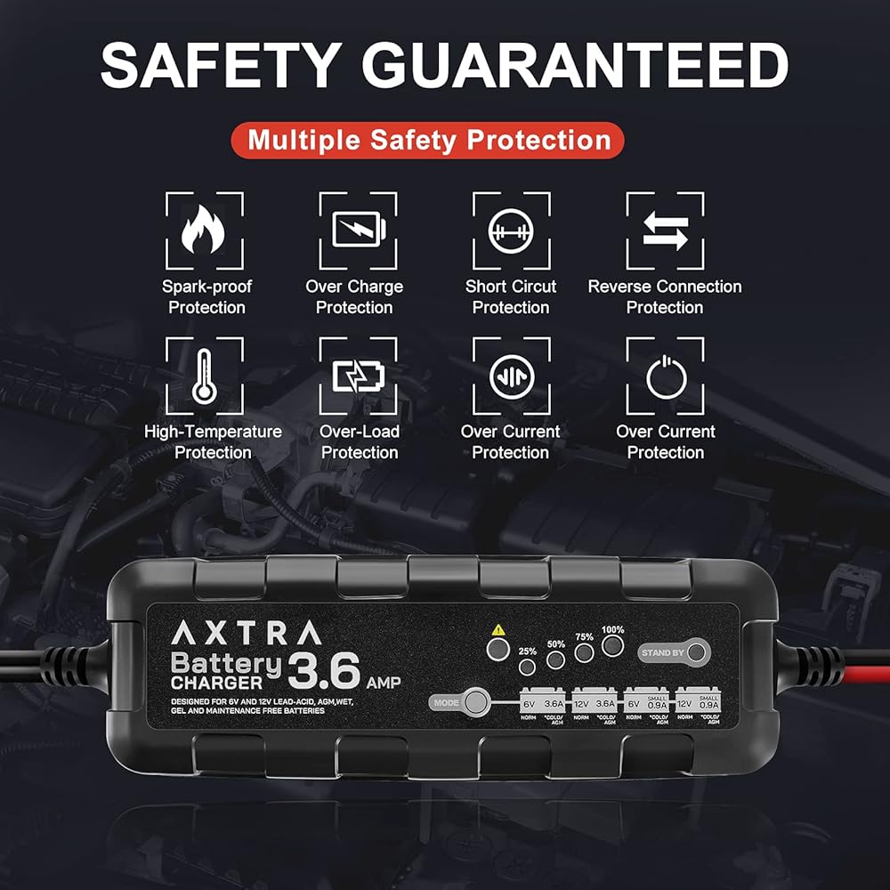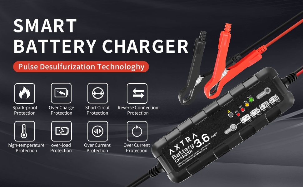 ميزات متعددة الاستخدامات: شاحن البطاريات الكل في واحد الأكثر تنوعًا، وحافظ البطارية والشاحن المتقطر، والشاحن العائم. المدمج في طبقات متعددة من حماية الدائرة ضد الشحن الزائد، والجهد الزائد، ودرجة الحرارة الزائدة، والقطبية العكسية، أو ماس كهربائى.