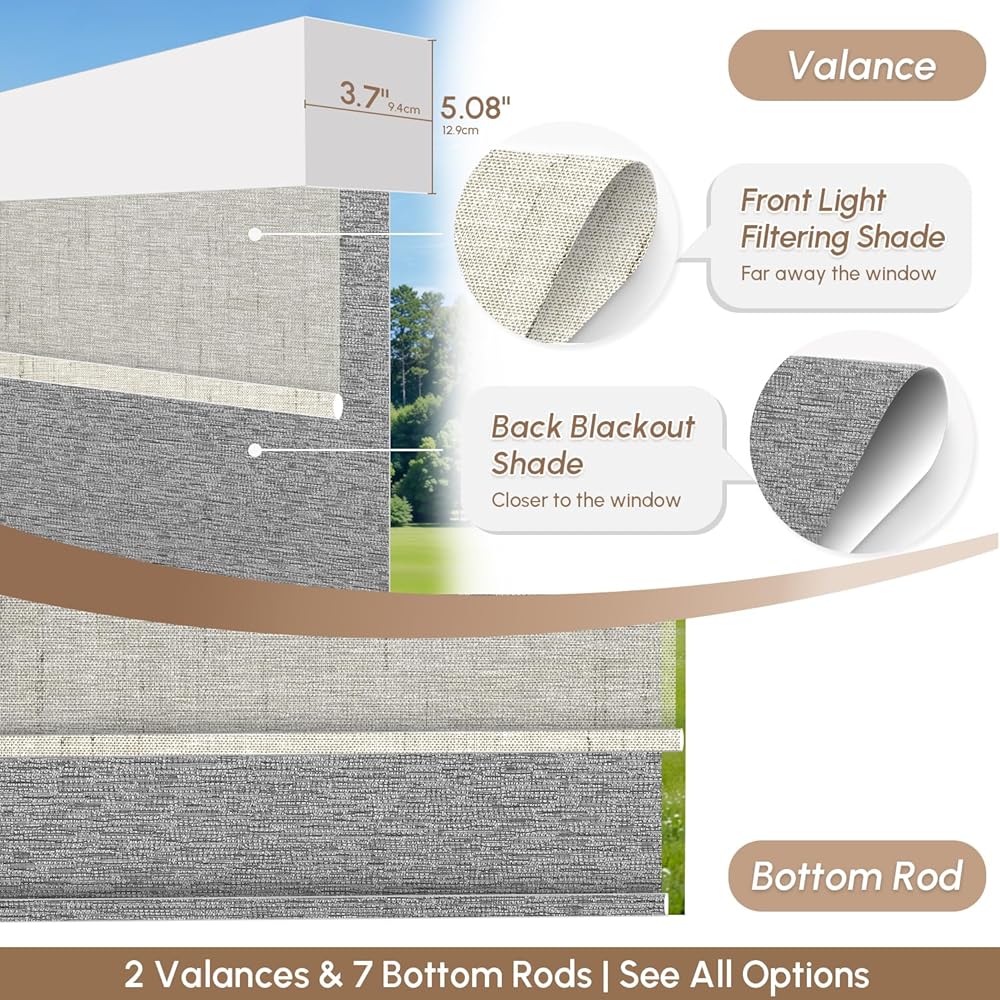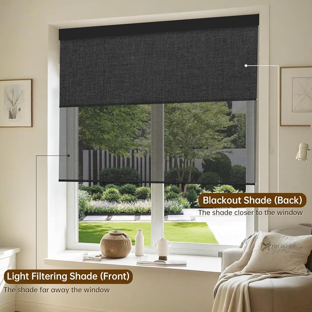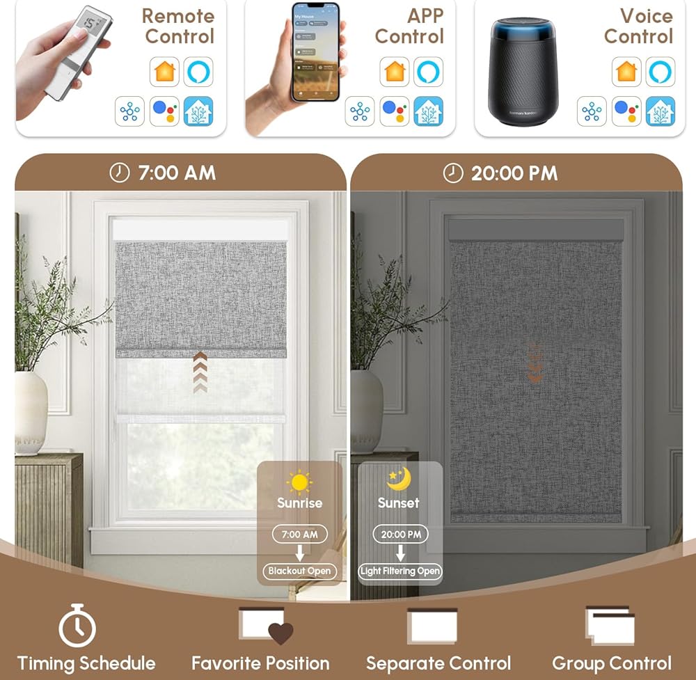 【Extremely Personalized Light-Blocking Solution - Motorized Dual Shades】 Motorized dual shades allow you to choose 2 fabrics for a personalized light-blocking plan. The blackout fabric can block 100% of the light, protecting your privacy, while the light filtering fabric offers soft sunlight, boosts air circulation, and avoids stuffiness. Motorized dual shades can keep the outdoor view clear in the day and provide a fully light-blocked private space at night.